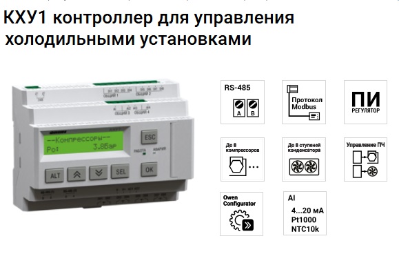 КХУ1 – специализированный контроллер для регулирования производительности компрессоров и конденсаторов в составе центральной холодильной машины. Прибор регулирует давление (или температуру) испарения и конденсации, обеспечивая круговой прогон хладагента. Применяется для автоматизации холодильных агрегатов в ритейле, в химической, фармацевтической, пищевой и перерабатывающей промышленности.