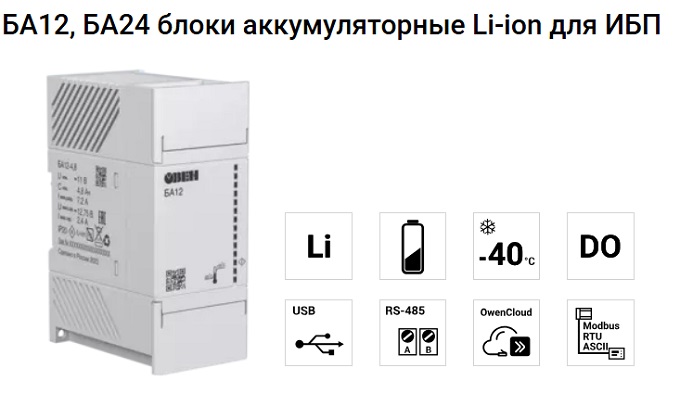 Блоки аккумуляторные для ИБП БА24 и БА12 со встроенным Li-on-аккумуляторными батареями предназначены для обеспечения резервного питания элементов автоматизированной системы управления технологическим процессом, а также прочих изделий и систем в промышленности. БА24 и БА12 являются частью «Экосистемы-210» компании ОВЕН и рекомендуется для совместного применения с ИБП.