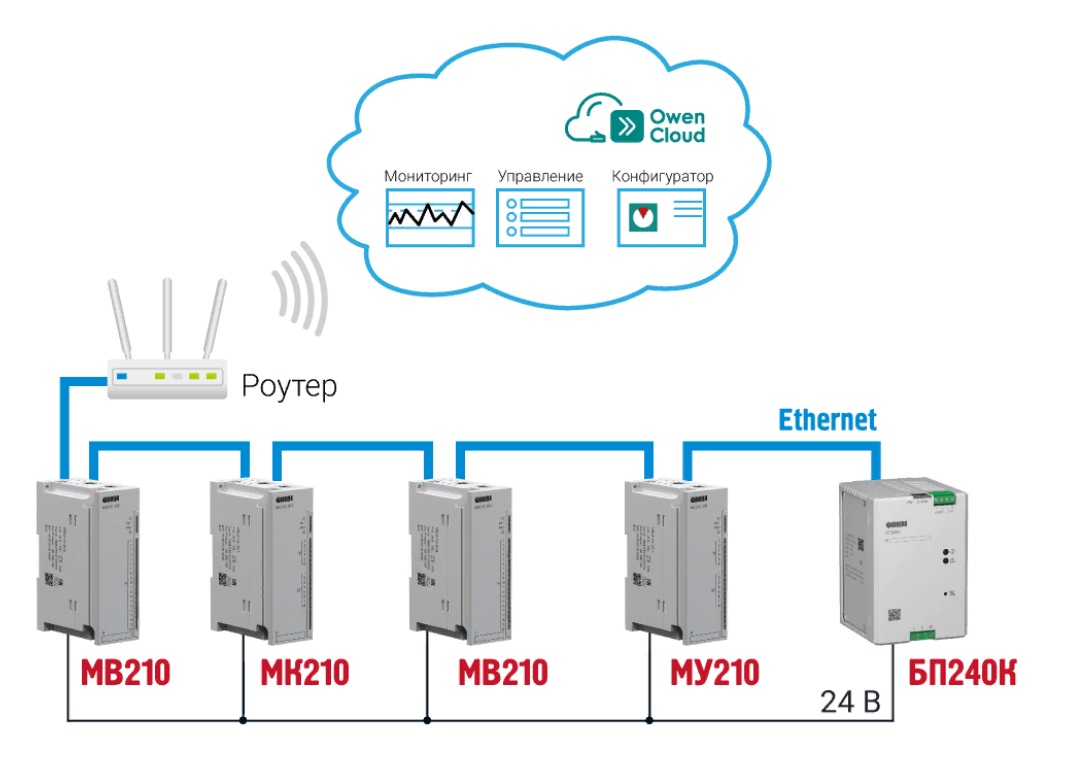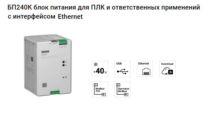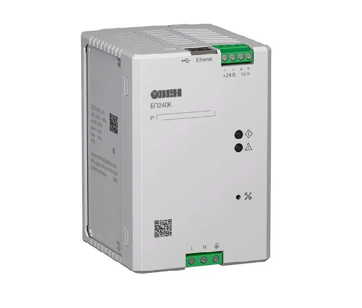 Описание БП240К блок питания для ПЛК и ответственных применений с интерфейсом EthernetБлок питания БП240К-24 предназначен для питания стабилизированным напряжением 24 В приборов локальной автоматики и распределенных систем. Прибор является частью «Экосистемы-210» компании ОВЕН и рекомендуется для совместного применения с программируемыми логическими контроллерами ПЛК210 и модулями ввода-вывода Мх210. Встроенные программные алгоритмы позволяют блоку питания БП240К-24 передавать данные о своем состоянии по сети Ethernet и в облачный сервис OwenCloud.![]() Особенности и преимущества блока питания БП240К: