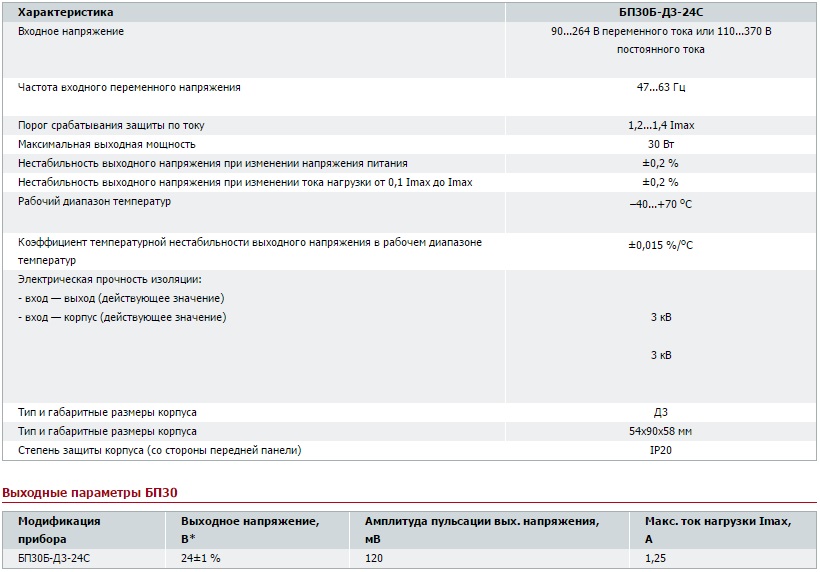 Описание Одноканальный блок питания ОВЕН БП30Б-Д3-24С с выходом 24 ВольтаНазначение прибора ОВЕН БП30Б-Д3-24СБлок питания БП30Б-Д3-24С предназначен для питания стабилизированным напряжением 24 В DC широкого спектра радиоэлектронных устройств (релейной автоматики, контроллеров, датчиков и т.п.) в условиях низких (до -40 ºС) и высоких (до +70 ºС) температур. Применяется для построения систем электропитания различной сложности, в том числе распределенных. Блок питания БП30Б-Д3 выпускается в корпусе с креплением на DIN-рейку типа Д3. Основные функции ОВЕН БП30Б-Д3-24С - Расширенное климатическое исполнение. Блоки питания функционируют в диапазоне окружающих температур от -40 до +70 ºС. Во всем диапазоне сохраняется заявленная мощность. - Эффективное преобразование напряжения. КПД не менее 85 %. - Отсутствие негативного влияния на системы автоматики. Соответствуют международным нормам по помехоэмиссии и помехоустойчивости. - Режим стабилизации тока при превышении номинальной мощности (питание высокоемкостной нагрузки). - Регулировка выходного напряжения с помощью внутреннего подстроечного резистора в диапазоне ±8 % от номинального выходного напряжения с сохранением мощности. - Защита от перенапряжения и импульсных помех на входе. - Защита от перегрузки, короткого замыкания и перегрева. ![]() Купить блок питания ОВЕН БП30Б-Д3-24С по выгодной цене можно в компании «Донские измерительные системы» Доставка блока питания ОВЕН БП30Б-Д3-24СМы доставим блок ОВЕН БП30Б-Д3-24С в течении одного - двух дней в города: Таганрог, Новочеркасск, Азов, Шахты, Волгодонск, Сальск, Краснодар, Тихорецк, Тимашевск, Сочи, Новороссийск, Анапа, Туапсе, Геленджик, Ейск, Майкоп, Армавир, Волгоград, Элиста, Астрахань, Ставрополь, Невинномысск, Минеральные Воды, Кисловодск, Пятигорск, Железноводск, Черкесск, Нальчик, Владикавказ, Грозный, Махачкала по выгодной цене. Пункты доставки БП30Б-Д3-24С транспортной компанией «Деловые линии».Мы доставим по выгодной цене блок питания ОВЕН БП30Б-Д3-24С до следующих пунктов выдачи: г. Таганрог , Чучева, 1 , г. Новочеркасск , Газетная, 21, г. Волгодонск , Прибрежная, 2а, г. Краснодар, А. Покрышкина, 2/4, г. Новороссийск , с. Цемдолина, Промышленная , 1, г. Сочи ,Краснодонская, 64, г. Пятигорск , Кисловодское, 48, г. Ставрополь, Кулакова, 28 б, г. Волгоград, Гумрак, Моторная, 9 а, г. Волжский , 2-й Индустриальный, 4 а, г. Севастополь , Фиолентовское, 1, Симферополь, Урожайная, 1, г. Астрахань, Энергетиков, 5а Пункты доставки БП30Б-Д3-24С курьерской компанией «СДЭК»Мы доставим по выгодной цене блок питания ОВЕН БП30Б-Д3-24С до следующих пунктов выдачи: г.Таганрог, Петровская, 42, г. Новочеркасск, площадь Левски, 5, г. Волгодонск, Морская, 76, г. Шахты, Советская, 200, г. Краснодар, Текстильная, 9, г. Армавир, Новороссийская, 2/4, г. Новороссийск, пр-т Ленина, 13, г. Сочи, Пластунская, 47 А, г. Георгиевск, Пушкина, 48, г. Ессентуки, Ермолова, 123, г. Кисловодск, Красивая, 30, г. Минеральные воды, 50 лет Октября, 67, г. Пятигорск, Московская, 68А, г. Ставрополь, 45 параллель, 31, г. Майкоп, Ленина, 6, г. Волжский, пр. Ленина 94, г. Махачкала, Буйнакского, 63, г. Хасавюрт, Аксаевское шоссе, 101, г. Нальчик, Темрюка Идарова, 129, г. Алушта, Таврическая, 3, г. Евпатория, Крупской, 60 А, г. Керчь, Советская, 15, г. Севастополь, Очаковцев, 34 А, г. Симферополь, Желябова, 44 А, г. Судак, Ленина, 78 Б, г. Ялта, Московская, 33, г. Владикавказ, Международная, 2, г. Грозный, Кадырова, 157, г. Астр