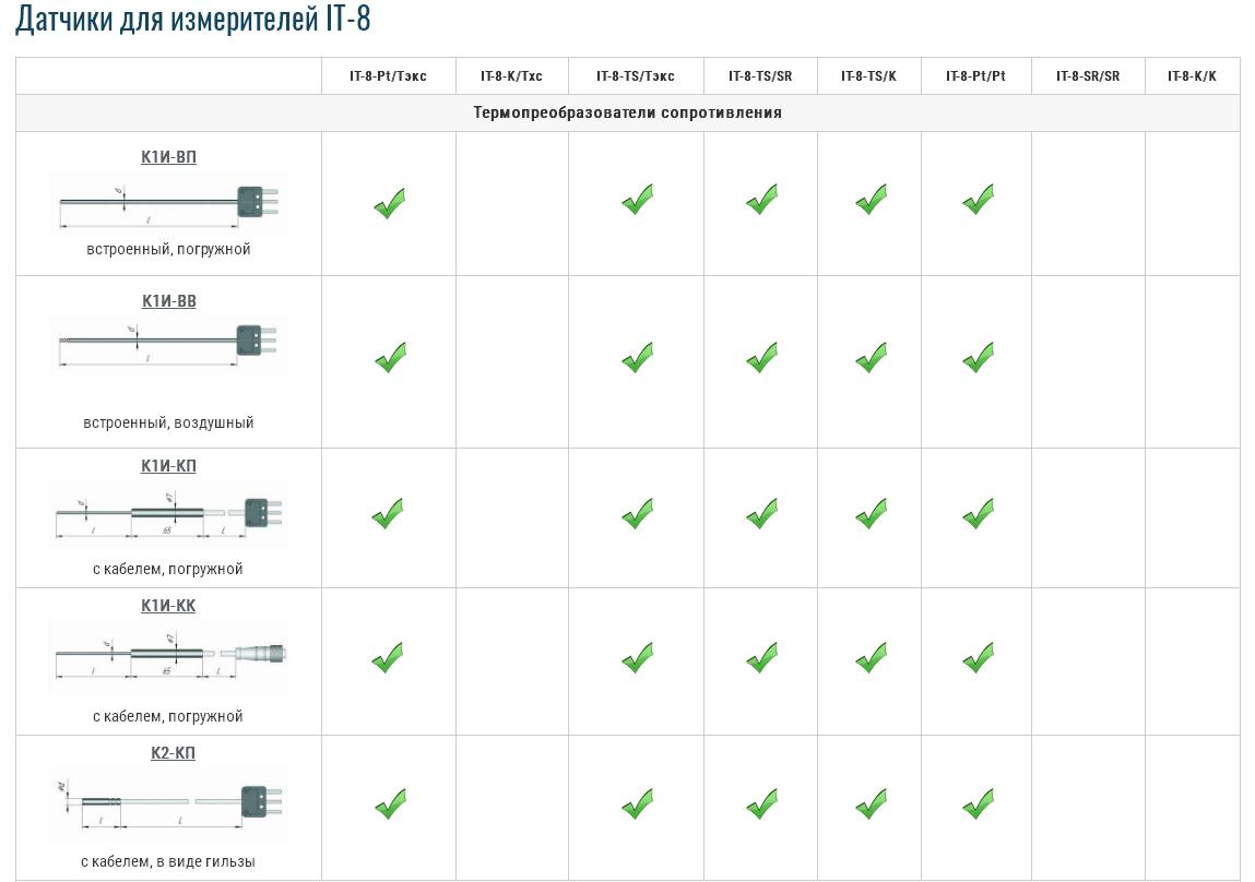 Описание Датчики для измерителей IT-8 ![]() ![]() Гибкая термопара К11-Р для контроля температуры в труднодоступных местах Гибкая термопара К11-Р типа K для измерителя температуры IT-8 -40...+800°С, для труднодоступных мест Термопара погружная К1-ВП для измерителя температуры IT-8 Погружная термопара К1-ВП типа K для измерителя температуры IT-8 -40...+800°С, для жидких и сыпучих сред Воздушная термопара K типа К1-ВВ для измерителя температуры IT-8 Воздушная термопара K типа К1-ВВ для измерителя температуры IT-8 -40...+800°С, для воздуха и неагрессивных газов Погружная термопара K типа К1-КП для измерителя температуры IT-8 Погружная термопара K типа К1-КП для измерителя температуры IT-8 -50...+800°С, для жидких и сыпучих сред Погружная термопара K типа К1-КПФ для измерителя температуры IT-8 Погружная термопара K типа К1-КПФ для измерителя температуры IT-8 -50...+250°С, для агрессивных сред Поверхностная термопара K типа КП1 для измерителя температуры IT-8 Поверхностные термопары K типа КП для измерителя температуры IT-8 -50...+500°С, для контроля температуры поверхности Датчик температуры в виде гильзы К2-КП для измерителя IT-8 Датчик температуры в виде гильзы К2-КП для измерителя IT-8 -50...+180°С, 50М, Pt100, Pt1000, 100П Погружной датчик температуры К1И-ВП для измерителя IT-8 Погружной датчик температуры К1И-ВП для измерителя IT-8 -50...+180°С, 50М, Pt100, Pt1000 для жидких и сыпучих сред Воздушный датчик температуры К1И-ВВ для измерителя IT-8 Воздушный датчик температуры К1И-ВВ для измерителя IT-8 -50...+180°С, 50М, Pt100, Pt1000 для воздуха и неагр.газов Погружной датчик температуры К1И-КП для измерителя IT-8 Погружной датчик температуры К1И-КП для измерителя IT-8 -50...+180°С, 50М, Pt100, Pt1000, 100П Погружной датчик температуры К1И-КК для измерителя IT-8. Контроль температуры внутри жидких и сыпучих продуктов Погружной датчик температуры К1И-КК для измерителя IT-8 -50...+180°С, 50М, Pt100, Pt1000, 100П Кабель удлинительный СК1-К для измерителя температуры IT-8 для термопар ХА(K), подключение через соед. L2 Кабель удлинительный С1-2 для измерителя температуры IT-8 для термосопротивлений, подключение через соед. L3 Кабель удлинительный С2-2 для измерителя температуры IT-8 для термосопротивлений, подключение через соед. R Кабель соединительный СК2-К для измерителя температуры IT-8 для термопар ХА(K), подключение через соед. L2 Похожие товары | |||||||