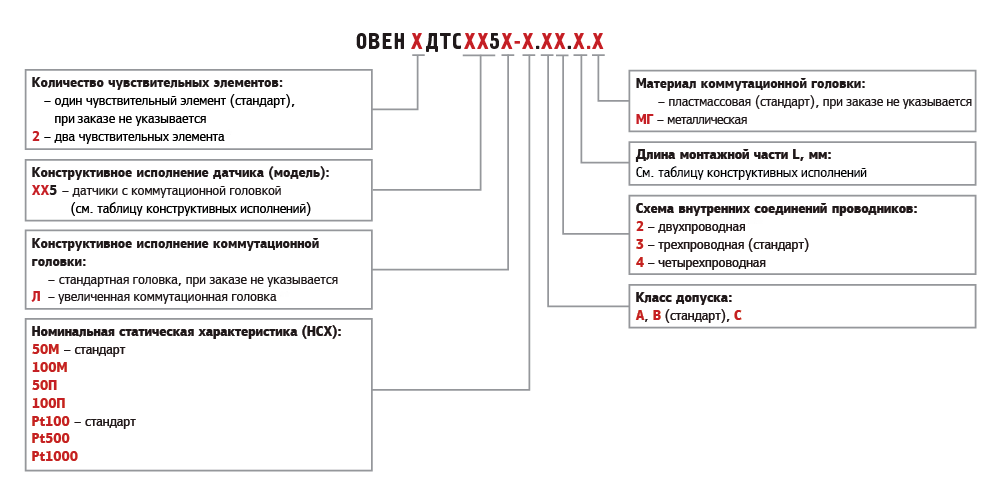 Основные характеристики датчиков температуры ОВЕН ДТСхх5 с коммутационной головкой: