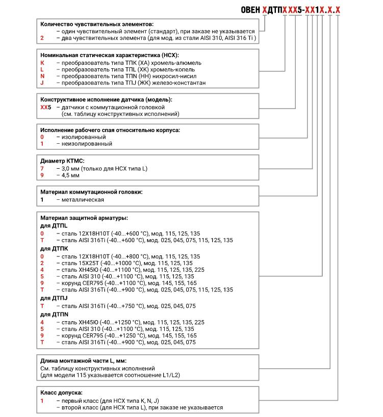Описание ДТП термопары на основе КТМС высокотемпературные модульные Термопары на основе КТМС предназначены для измерения температуры жидких, твердых и газообразных сред, в т.ч. с высокой температурой (до 1250 °С), не агрессивных к материалу корпуса датчика. В качестве материалов термоэлектродов для КТМС применяются различные сплавы, что определяет характеристики термопар и возможности их применения: хромель-копель (L). Термопары обладают высокой стабильностью при температурах до 600 °С; хромель-алюмель (K). Термопары отличаются стойкостью к окислению при высоких температурах до 1100 °С; нихросил-нисил (N). Имеют высокую стабильность и широкий диапазон рабочих температур: от -40 до +1250 °С, что позволяет использовать их для замены дорогостоящих термопар из драгоценных металлов. железо-константан ЖК (J). Универсальные термопары для измерения температур до +750 ℃. Функциональные преимущества термопар из КТМС по сравнению с проволочными термопарами низкий показатель тепловой инерции (2 сек – для КТМС диаметром 4,5 мм) для регистрации быстропротекающих процессов; высокая стабильность и увеличенный рабочий ресурс (превышение в 2-3 раза по сравнению с обычными); возможность изгиба, монтажа в труднодоступных местах и кабельных каналах (60-100 м); разные варианты установки: приваривать, припаивать или крепить термопару (хомутом, на винт) к поверхности; выдерживают большие рабочие давления (до 150 МПа); для дополнительной защиты термоэлектродов от воздействия окружающей среды термопары могут производиться в защитных чехлах. ![]() Термопары мод. 025, 045, 075, 125…165, 225 имеют модульную (разборную) конструкцию. Если в процессе эксплуатации чувствительный элемент вышел из строя, а защитный чехол из корунда или жаростойкой стали остался цел, оптимальным решением будет заменить только вставку, а не менять весь датчик. Замена вставки проста и может производиться без демонтажа высокотемпературного датчика Похожие товары | |||||||