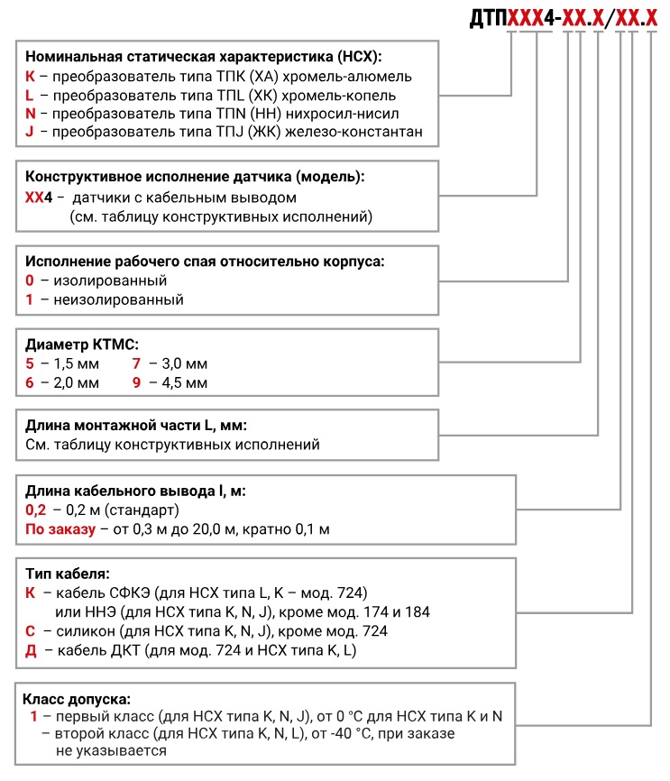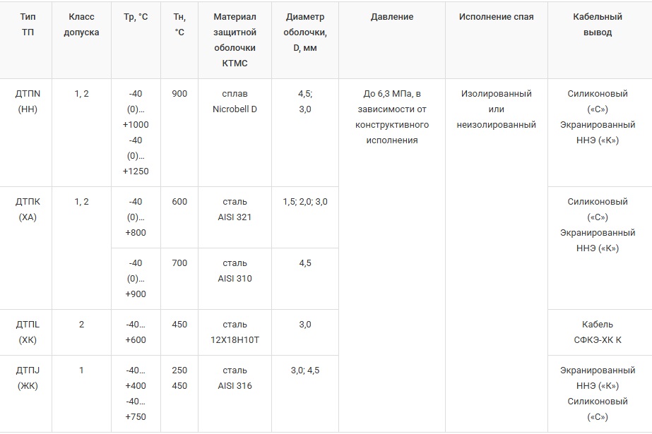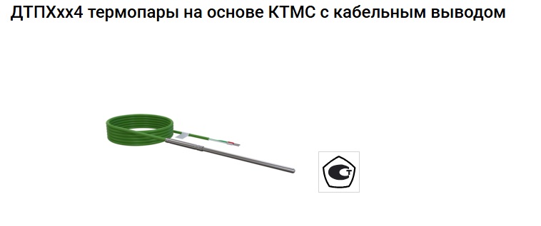 Описание ДТПХхх4 термопары на основе КТМС с кабельным выводом Термоэлектрические преобразователи на основе КТМС (кабельные) предназначены для измерения температур от -40 до +400…1250 °С в зависимости от конструктивного исполнения и типа термопары. ![]() Описание и устройство КТМС приведено в Справочной информации по термопарам. Типы термопар ОВЕН на основе КТМС по ГОСТ 8.585-2001: хромель-копель ТХК (L). Термопары обладают высокой стабильностью при температурах до 600 °С; хромель-алюмель ТХА (K). Термопары отличаются стойкостью к окислению при высоких температурах до 1100 °С; железо-константан ТЖК (J). Универсальные термопары для измерения температур от -40 до +750 °С нихросил-нисил ТНН (N). Имеют высокую стабильность и широкий диапазон рабочих температур: от -40 до +1250 °С. Могут использоваться для замены дорогостоящих термопар из драгоценных металлов. Все типы термопар подробно описаны в наших статьях. Среда измерения Твердые, жидкие и газообразные среды, не агрессивные к материалу корпуса датчика. Отличительные особенности Монтажную (погружную) часть датчика можно изгибать. Кабельный вывод обеспечивает удобство и быстроту монтажа. Имеют сертификат Средств измерений и проходят первичную поверку на заводе-изготовителе. Стандартный срок производства – от 5 рабочих дней. Технические характеристики ДТПХхх4 ![]() ![]() Похожие товары | |||||||