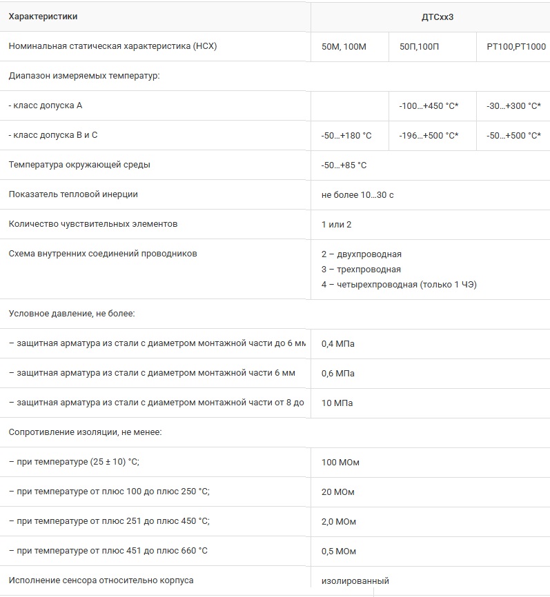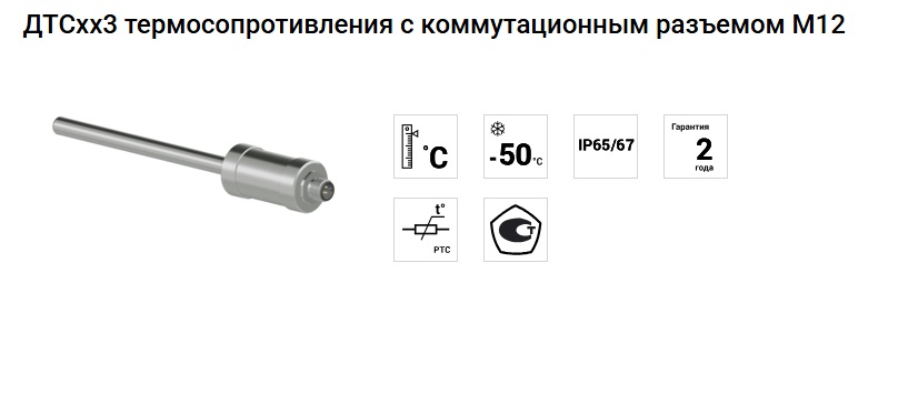 Описание ДТСхх3 термосопротивления с коммутационным разъемом М12Датчики температуры ДТСхх3 с коммутационным разъемом М12 позволяют измерять температуру до 500 °С (ДТС с платиновым ЧЭ) и до 180 °С (ДТС с медным ЧЭ). Подключение к измерительной линии производится медным кабелем (кабель в комплекте не идет, заказывается отдельно).Ответная часть разъема М12 не входит в комплект поставки и приобретается отдельно. Для заказа доступны разборные разъёмы М12 или формованные кабельные сборки М12. ![]() Номинальные статические характеристики (НСХ) по ГОСТ 6651-2009: 50М и 100М (W100 = 1,428, α = 0,00428 °С-1) 50П и 100П (W100 = 1,391, α = 0,00391 °С-1) РТ100, РТ1000 (W100 = 1,385, α = 0,00385 °С-1) Среда измерения Твердые, жидкие и газообразные среды (неагрессивных к защитной арматуре и материалу чувствительного элемента ЧЭ датчика). Отличительные особенности ДТСхх3 с М12: Удобство монтажа: разъем М12 (1 ЧЭ – 4 pin, 2 ЧЭ – 4pin; 6 pin) Большое количество исполнений за счет новой маркировки По устойчивости к воздействию синусоидальных вибраций по ГОСТ Р 52931-2008 датчики без монтажных элементов (в гладкой защитной арматуре) соответствуют группе V2, с монтажными элементами – группе N2. Основные характеристики Вероятность безотказной работы при соблюдении условий эксплуатации: ДТС с платиновым ЧЭ от -50 до +250 °С – не менее 0,95 за 40 000 ч; от -196 (-60 °С – для РТ100, РТ1000) до -50 °С и от +250 °С до + 450 °С – не менее 0,95 за 15 000 ч. ДТС с медным ЧЭ от -50 до +150 °С – не менее 0,95 за 15 000 ч. Для монтажа датчиков ДТСхх3 на объекты рекомендуется применять гильзы ГЗ.16 и ГЗ.25, бобышки Б.П.1, Б.П.2 и Б.У.1, а также съемные подвижные штуцеры ШП. Стандартный срок производства – от 5 рабочих дней Технические характеристики ДТСхх3 ![]() Похожие товары | |||||||