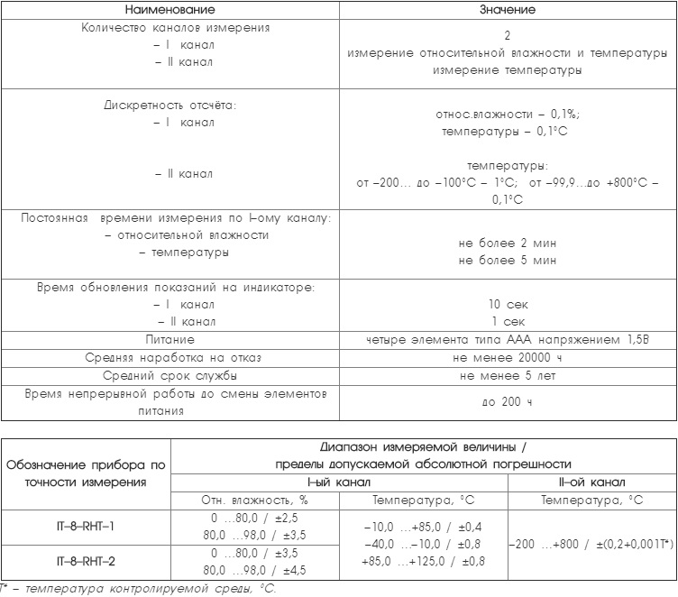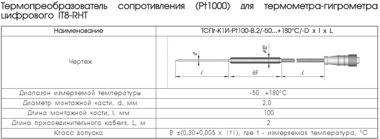 Описание Термометр - гигрометр цифровой портативный IT-8-RHT с одной стороны продолжил линейку наших новых портативных цифровых измерителей температуры IT-8, с другой стороны расширил ассортимент выпускаемых нами портативных цифровых термогигрометров. Как и все переносные измерители цифровые IT-8 новый термометр - гигрометр рассчитан на работу в жёстких условиях эксплуатации с температурой наружного воздуха от мин. 40 до +55⁰С. Первичный преобразователь также подсоединяется к прибору через разъём, что позволяет использовать измеритель с несколькими датчиками одновременно, а также легко заменить преобразователь в случае выхода его из строя. Отличительные особенности термометра-гигрометра • Широкий диапазон температуры эксплуатации от мин 40°С до +55°С • Подключение взаимозаменяемых первичных преобразователей через соединители • Два варианта подключения преобразователя температуры и влажности: жёстко к корпусу, через соединительный кабель • Наличие дополнительного канала с НСХ Pt1000 для измерения температуры в широком диапазоне • Широкий ассортимент датчиков температуры для дополнительного канала измерения • Высокая точность измерения • Низкая дополнительная температурная погрешность • Задание порога звуковой и световой сигнализации • Запоминание макс. и мин. значений • Яркий большой светодиодный индикатор с режимом энергосбережения • Возможность пользовательской юстировки без нарушения заводской настройки • Прочный, герметичный, с прорезиненными вкладышами корпус Новый переносной термометр - гигрометр IT-8-RHT позволяет контролировать влажность также в единицах температуры точки росы (инея). Отличительной особенностью нового термометра – гигрометра портативного IT-8-RHT от большинства аналогов является наличие дополнительного входа с НСХ Pt1000 для измерения температуры в очень широком диапазоне и с высокой точностью. Модификации термометра – гигрометра цифрового: • по точности: – IT–8–RHT–1 – термометр – гигрометр повышенной точности; – IT–8–RHT–2 – термометр – гигрометр нормальной точности. Исполнения отличаются между собой только типом используемого преобразователя температуры и влажности. Комплект поставки термометра-гигрометра В комплект поставки прибора входит соединительный кабель позволяющий реализовывать два варианта исполнения прибора: со встроенным преобразователем температуры и влажности и с выносным зондом температуры и влажности, а также термопреобразователь сопротивления платиновый Pt1000 ![]() При использовании преобразователя температуры и влажности без удлинительного кабеля диапазон измеряемой температуры по I–ому каналу не может быть больше диапазона температуры эксплуатации прибора. Примечания: 1. Диапазон измерения температуры термометра - гигрометра цифрового по II–ому каналу с термопреобразователем равен области пересечения диапазонов измерения термометра - гигрометра и термопреобразователя, а суммарная абсолютная погрешность равна сумме абсолютных погрешностей термометра - гигрометра и термопреобразователя. 2. С целью уменьшения суммарной погрешности термометра - гигрометра и термопреобразователя в приборе имеется возможность юстировки введением поправочных коэффициентов. 3. Дополнительная погрешность II–ого канала термометра - гигрометра, вызванная изменением т