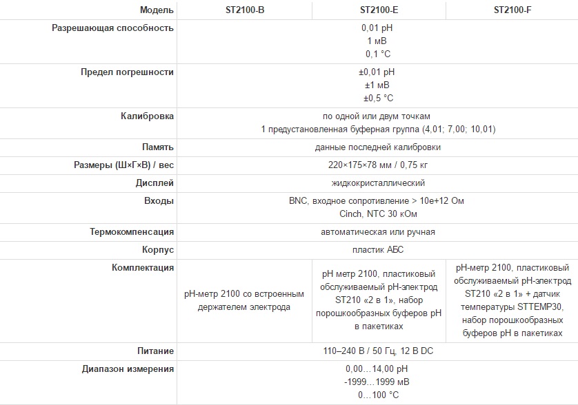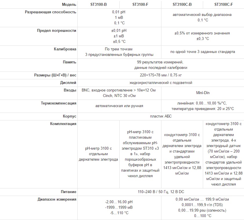 Описание Надежные и точные приборы для решения разнообразных задач в лаборатории Компания OHAUS, которая уже более века производит высокоточные и долговечные весоизмерительные приборы, сегодня предлагает вам серию настольных приборов для электрохимических измерений. Это приборы для измерения pH и удельной электропроводности, которые позволяют также измерять соленость, общее солесодержание (TDS) и редокс-потенциал (ОВП). Серия Starter включает широкий выбор моделей от приборов базового уровня, обладающих прекрасными характеристиками и привлекательной ценой, до многофункциональных современных приборов с лучшим на рынке соотношением цены и качества. Основные особенности - Интуитивное ПО приборов Starter — интуитивно понятное программное обеспечение и удобная организация ЖК-дисплея упрощают и ускоряют работу. - Функциональный дизайн повышает удобство работы — пять кнопок управления с четкой маркировкой функций, а также встроенные или отдельные держатели электродов облегчают настройку настольных приборов серии Starter и получение точных результатов. - Достоверные результаты калибровки повышают точность измерений — приборы Starter отображают ход калибровки на дисплее, гарантируя высокую точность результатов. Starter 2100 Starter 2100 станет оптимальным выбором для тех, кому нужен недорогой pH-метр, позволяющий стабильно получать достоверные результаты измерений. ![]() - Встроенный держатель электрода - Функция автоматического распознавания буферов - Cохранение в памяти данных калибровки - При калибровке на дисплее появляются индикаторы, подтверждающие точность процесса калибровки - Индикаторы состояния электрода информируют о необходимости выполнения калибровки ![]() ![]() Starter 3100 Starter 3100 поддерживает множество функций, повышающих эффективность его работы. ![]() - Трехточечная калибровка - Автоматическая или ручная термокомпенсация - Автоматическое или ручное определение момента установления показаний - Регулируемый по высоте отдельный держатель электрода - Функция автоматического распознавания буферов - Сохранение в памяти данных калибровки - Возможность сохранения в памяти 99 результатов измерений - Вызов на дисплей данных последней калибровки одним нажатием кнопки - Программная функция самодиагностики - При калибровке pH-электрода на дисплее появляются индикаторы, подтверждающие точность процесса калибровки - Индикаторы состояния электрода информируют о необходимости выполнения калибровки - Возможность подключения периферийных устройств через порт RS232 Starter 3100C Starter 3100C позволяет точно измерять удельную электропроводность, соленость и общее солесодержание (TDS), а многочисленные дополнительные функции упрощают работу с этим прибором. - Выбор режимов измерения удельной электропроводности, солености и общего солесодержания одним нажатием кнопки - Регулируемый по высоте отдельный держатель электрода - Четырехэлектродный датчик с широким диапазоном измерения электропроводности не подвержен поляризации и загрязнению - Автоматическая термокомпенсация с возможностью указания температурного коэффициента - Автоматическое или ручное определение момента установления показаний - Возможность сохранения в памяти 99 результатов измерений - Вызов на дисплей данных последней калибровки одним нажатием кнопки - Возможность подключения периф