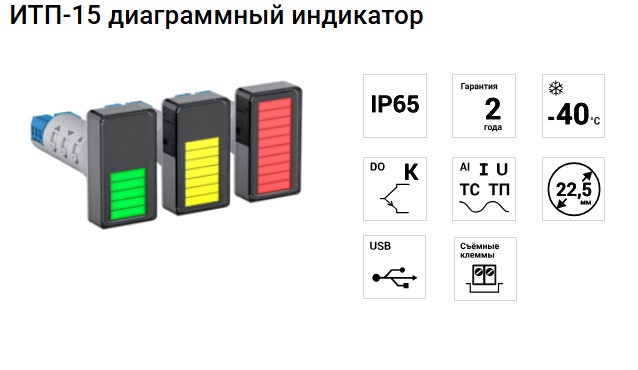 Описание ИТП-15 диаграммный индикаторДиаграммный индикатор ИТП-15 предназначен для качественного отображения параметров технологического процесса на 10-сегменнтном индикаторе. Барграф ИТП-15 на своем индикаторе отображает состояние измеряемой величины зеленым, желтым и красными цветами. Границы цветовых зон настраиваются с помощью программы на компьютере.Диаграммный индикатор ИТП-15 имеет удобный корпус для монтажа в отверстие светосигнальной арматуры, что делает удобным его применение в диспетчерских пультах и операторских комнатах. Аналоговый вход обеспечивает возможность работы с разными сигналами: унифицированные сигналы тока и напряжения, термосопротивлений и термопар, датчиков давления, уровня, влажности, концентраций вещества, расхода, положений запорной арматуры и пр. ![]() Функциональные возможности приборов ИТП