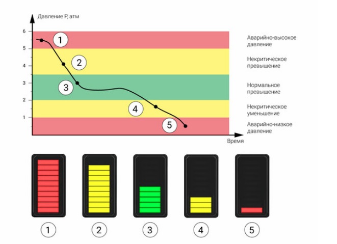 Засветка сегментов желтым, зеленым или красным цветом в зависимости от текущей измеренной величины. Конструктивные особенности: