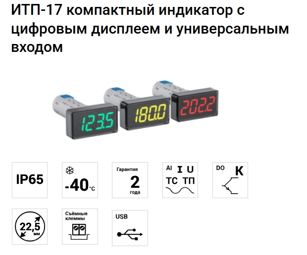Описание ИТП-17 компактный индикатор с цифровым дисплеем и универсальным входом Компактный индикатор ИТП-17 предназначен для измерения и отображения параметров технологического процесса на цифровом 4-значном дисплее. Трехцветный индикатор отображает состояние измеряемой величины зеленым, желтым и красными цветами. Пороги смены цвета настраиваются. ![]() Универсальный аналоговый вход допускает подключение различных видов сигналов от датчиков температуры, давления, уровня, значений мощности, влажности, концентраций вещества, расхода и пр. Встроенный сигнализационный выход включается при достижении критической величины и позволяет активировать звуковую сигнализацию, индикатор на пульте диспетчера, а также произвести автоматическую блокировку работы до возвращения измеряемой величины в нормальный диапазон . Функциональные возможности приборов ИТП-17