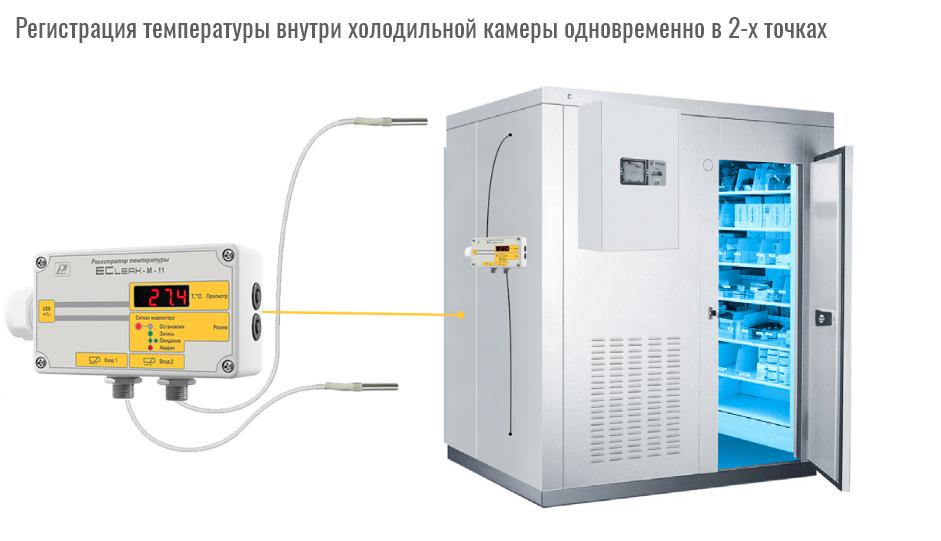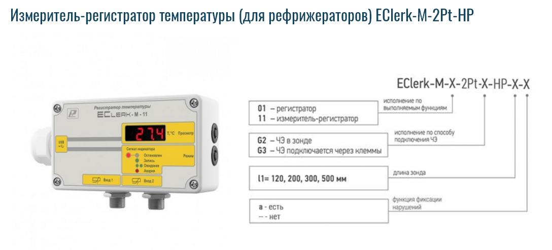 Описание Измеритель-регистратор температуры (для рефрижераторов) EClerk-M-2Pt-HPизмерение температуры в 2-х точках;• 2 канала • функция фиксации нарушения • диапазон измерения температуры –50…+200°С • объём памяти не менее 500000 значений • точность от ±(0,2+0,001Т) • герметичный корпус • яркий светодиодный индикатор (опция) • диапазон температуры эксплуатации –40…+55°С • современное ПО на 2-х языках для работы с данными • возможность записи с временными интервалами ![]() Измерители – регистраторы температуры автономные (терморегистраторы) серии EClerk–М в герметичном пластмассовом корпусе оптимально подходят для применения в рефрижераторах, а также для измерений (совместно с первичными измерительными преобразователями) температуры жидкостей, газов и сыпучих продуктов и записи результатов измерений во внутреннюю память прибора с последующей обработкой полученной информации на персональном компьютере. Благодаря герметичному корпусу приборы можно применять в запылённых, неотапливаемых помещениях. Регистраторы температуры могут использоваться для мониторинга условий перевозки в транспортных средствах, в том числе в грузовых автомобилях, рефрижераторах, железнодорожных вагонах, в том числе при перевозке лекарственных препаратов. Измерители - регистраторы EClerk–М-2Pt-HP снабжены герметичными разъёмами с винтовым зажимом внешних выводов для подключения внешних термопреобразователей сопротивления типа НСХ Pt1000. Для настенного монтажа приборов рекомендуем использовать кронштейн. Регистрация значений параметров температуры осуществляется: – в автономном режиме; – в режиме «Online» с подключением к USB–порту персонального компьютера. Терморегистратор EClerk-M в зависимости от наличия или отсутствия светодиодного индикатора выполняет функции: регистратора (нет индикатора, есть память), измерителя - регистратора (есть индикатор, есть память). Для терморегистратора, имеющего функцию фиксации нарушений, при настройке можно добавить верхнюю и нижнюю границу измеряемого параметра и максимально разрешённое время нахождения вне этих границ, свидетельствующее о нарушении. Если при работе прибора измеряемый параметр находился вне установленных границ дольше заданного времени, на приборе со светодиодным индикатором фиксируется метка нарушения. Метку нарушения можно снять только при переконфигурировании прибора и удалении из него всех записанных данных. При анализе данных и формировании Отчёта для данного прибора действует защита от изменения настроек нарушения. ![]() Программное обеспечение Перед использованием терморегистратора его необходимо настроить. Для этого скачайте на свой ПК программу EClerk v.2 и подключите прибор при помощи прилагаемого USB кабеля. Управление прибором осуществляется кнопкой с правой стороны корпуса. После окончания процесса регистрации при помощи ПО EClerk v.2 можно проанализировать полученные данные, подготовить и распечатать Отчёт. ![]() Возможности ПО • настройка (конфигурирование) прибора; • работа с файлами данных; • работа в режиме Online (USB–измеритель); • фильтрация по максимальному и минимальному значению, по времени; • представление данных в виде таблицы и графика; • высокая разрешающая способность представления данных; • подготовка Отчёта; экспорт в Excel; • русский и английский язык; • возможность юстиров