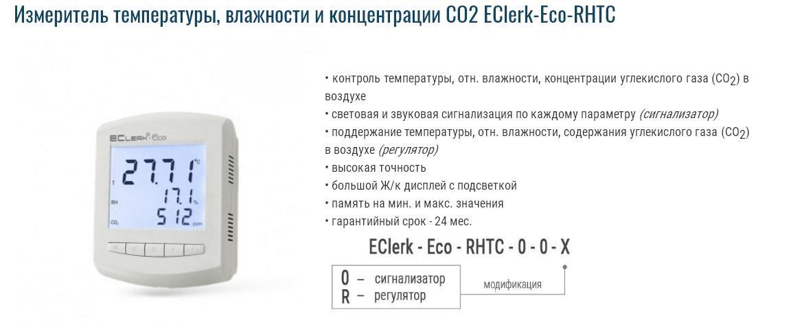 Описание Измеритель температуры, влажности и концентрации CO2 EClerk-Eco-RHTCИзмеритель EClerk-Eco-RHTC это современный прибор, предназначенный для непрерывного измерения, контроля и регулирования важнейших для здоровья человека параметров воздушной среды: температуры, относительной влажности, концентрации в воздухе углекислого газа (СО2).![]() Измеритель качества EClerk-Eco-RHTC можно использовать в домашних условиях, в том числе для своевременного проветривания комнат, ручного или автоматического управления приборами поддержания климата. Также прибор может использоваться в детских садах и школах, музеях, хранилищах, концертных зала и театрах, медицинских учреждениях. Измеритель позволяет увеличить объём и улучшить качество продукции при выращивании грибов и овощей, выведении цыплят в инкубаторах и т.д. Модификации EClerk-Eco-RHTC Измеритель-сигнализатор качества воздуха EClerk-Eco-RHTC-0-0-0. Позволяет измерять значения контролируемых параметров и сигнализировать о выходе любого из данных значений за установленные пределы. Измеритель-регулятор качества воздуха EClerk-Eco-RHTC-0-0-R. В отличие от EClerk-Eco-RHTC-0-0-0 вместо сигнализации имеет в своем исполнении двухпозиционный регулятор и выносной коммутационный блок управления нагрузками, что позволяет регулировать значения температуры, отн. влажности и содержания углекислого газа (СО2) в воздухе с помощью исполнительных устройств (ТЭНов, вентиляторов, увлажнителей воздуха и т.д.). В измерителе использованы новейшие сенсоры Швейцарской компании Sensirion, которые обеспечивают высокую точность измерения и стабильность параметров в течение длительного времени эксплуатации. Измеритель EClerk-Eco-RHTC изготовлен в современном корпусе, предназначенном для настенного монтажа, при помощи специального кронштейна, который входит в комплект поставки. На фронтальной поверхности находится большой жидко-кристаллический (Ж/к) индикатор, кнопки управления. На нижней боковой поверхности измерителя имеется вход micro USB для подключения адаптера питания. На обратной стороне корпуса имеется батарейный отсек для установки элементов резервного питания прибора. Сенсоры измеряемых параметров находятся в корпусе прибора. Перфорация на корпусе необходима для хорошего воздухообмена внутренней полости с сенсорами и внешней средой. Для измерителя EClerk-Eco-RHTC внешнее питание является основным. Питание от батарей является резервным и позволяет использовать измеритель во время отключения внешнего питания, либо для использования прибора в качестве переносного измерителя для экспресс-контроля качества воздуха в различных помещениях. Переход питания с внешнего на внутренний происходит автоматически без участия пользователя. Для измерения отн. влажности используется емкостной сенсор. Для контроля CO2 применён сенсор NDIR, основанный на оптическом поглощении инфракрасного излучения. Для обеспечения длительной работы сенсора измеритель-сигнализатор EClerk-Eco-RHTC снабжён функцией автокалибровки в процессе эксплуатации. Похожие товары | |||||||