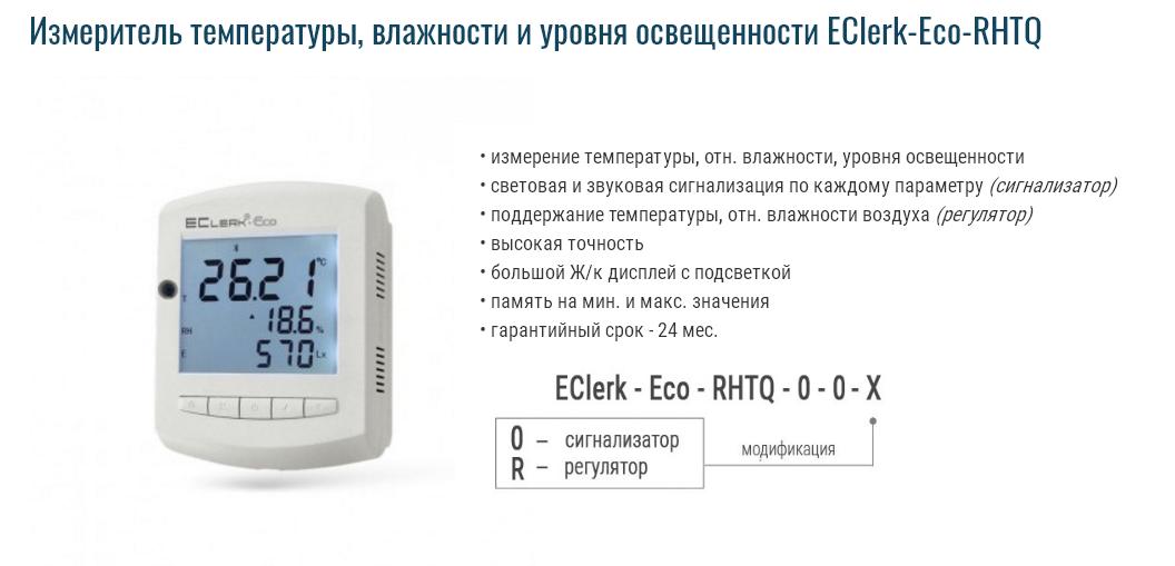 Описание Измеритель температуры, влажности и уровня освещенности EClerk-Eco-RHTQИзмеритель EClerk-Eco-RHTQ это современный прибор, предназначенный для непрерывного измерения, контроля и регулирования важнейших для здоровья человека параметров воздушной среды: температуры, относительной влажности, уровня освещенности.Измеритель можно использовать в домашних условиях, особенно в семьях с маленькими детьми, в семьях с больными различными лёгочными и сердечно‐сосудистыми заболеваниями, в дошкольных и общеобразовательных учреждениях и т.д. Также измеритель может применяться в сельском хозяйстве, в промышленности, в научно‐испытательных институтах и т.д. ![]() Модификации EClerk-Eco-RHTQ Измеритель-сигнализатор EClerk-Eco-RHTQ-0-0-0. Позволяет измерять значения контролируемых параметров и сигнализировать о выходе любого из данных значений за установленные пределы. Измеритель предназначен для работы с элементами питания типа АА (1,5 В). Измеритель-регулятор EClerk-Eco-RHTQ-0-0-R. Прибор комплектуется выносным блоком питания и управления нагрузками. Измеритель позволяет регулировать температуру и отн.влажность по двухпозиционному закону с помощью исполнительных устройств (ТЭНов, вентиляторов, увлажнителей воздуха и т.д.). Основное питание измерителя-регулятора EClerk-Eco-RHTQ-0-0-R - внешнее. Элементы питания предназначены для работы прибора в отсутствии внешнего питания. Питание от батарей является резервным и позволяет использовать измеритель при отключении внешнего питания, либо как переносной прибор в качестве измерителя для экспресс-контроля. В измерителе EClerk-Eco-RHTQ использованы новейшие сенсоры компаний Sensirion и ROHM Co. Ltd , которые обеспечивают высокую точность измерения и стабильность параметров в течение длительного времени эксплуатации. Измеритель EClerk-Eco-RHTQ изготовлен в современном корпусе, предназначенном для настенного монтажа при помощи специального кронштейна, который входит в комплект поставки. На фронтальной поверхности находится большой жидко-кристаллический (Ж/к) индикатор, кнопки управления. На обратной стороне корпуса имеется батарейный отсек для установки элементов питания прибора. Сенсоры измеряемых параметров находятся в корпусе прибора. Перфорация на корпусе необходима для хорошего воздухообмена внутренней полости с сенсорами и внешней средой. Похожие товары | |||||||