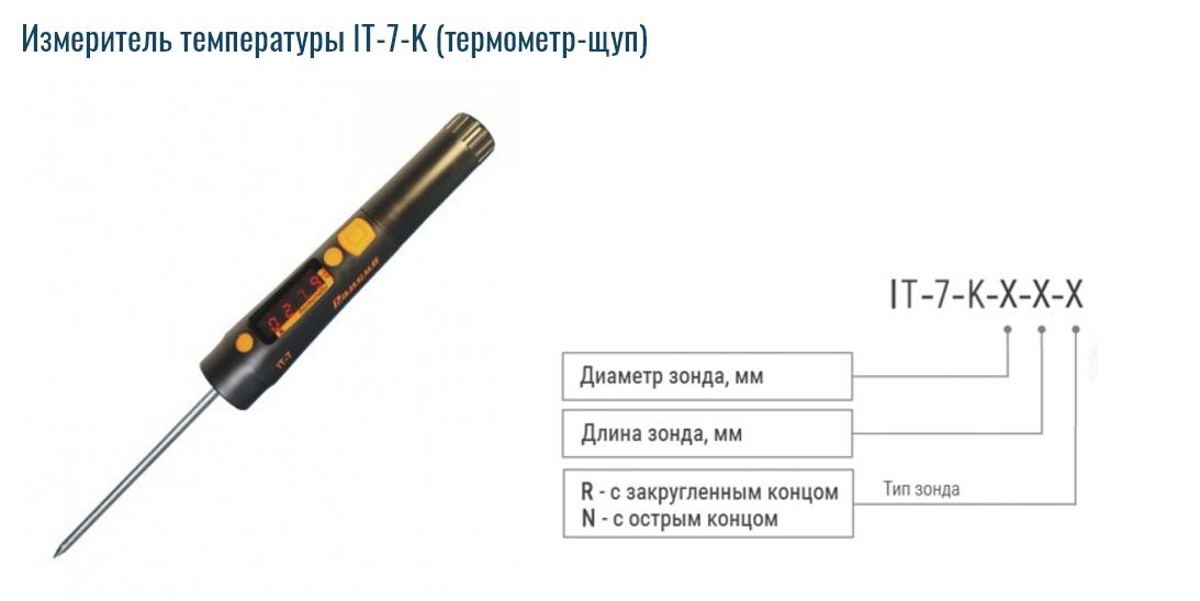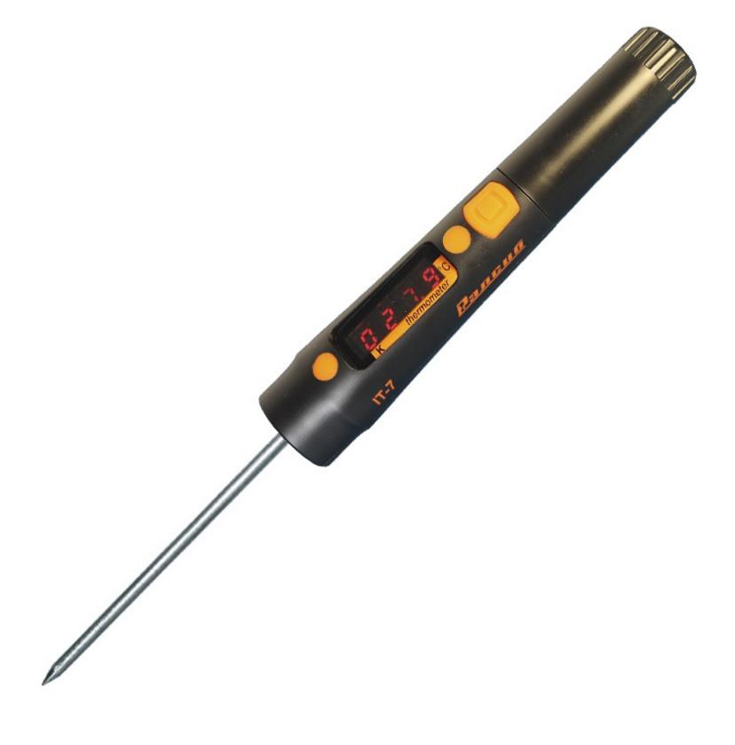 Описание Измеритель температуры IT-7-K (термометр-щуп)• Диапазон измерения температуры -50…+800°C• Точность от ±0,5°С • Удобство • Механическая прочность • Влаго- и пыле- защищённость. • Невысокая стоимость эксплуатации • Гарантия - 2 года ![]() Описание измерителя температуры Рэлсиб IT-7-KИзмеритель температуры IT-7 (термометр-щуп) предназначен для измерения температуры газообразных, жидких и сыпучих сред. Благодаря использованию хромель-алюмелевой термопары К(ХА) прибор имеет очень широкий диапазон измерения от -50 до +800°C. Рабочий конец термопары находится на конце зонда. Для получения точных значений измерения рекомендуется устанавливать зонд в измеряемую среду на глубину не менее 20 мм. Зонд изготовлен из пищевой нержавеющей стали, поэтому прибор можно использовать в пищевой промышленности. Зонд может иметь как округлый, так и заостренный конец. Наименьшую тепловую инерционность имеют приборы с диаметром зонда 2 мм. Для более жёстких условий эксплуатации выпускаются приборы с диаметром зонда от 3,0 до 5,0 мм. Прибор управляется только одной кнопкой. После нажатия кнопки термометр-щуп сразу же начинает процесс измерения. Через 10 с. прибор автоматически отключается. Для экономии элемента питания рекомендуется включать прибор после установления температуры (через некоторое время после установки зонда прибора в измеряемую среду). Диапазон измерения температуры -50…+800°C Основная абсолютная погрешность ±(0,5+0,001|Т|*)°С Напряжение питания от 0,9 до 1,6 В Батарея питания типоразмер ААА напряжением 1,5 В Число каналов измерения 1 Дискретность отчета 0,1°C Время индикации до автоматического отключения 10 с Продолжительность непрерывной работы измерителя от элемента питания до 85 ч Средняя наработка на отказ не менее 20000 ч Средний срок службы 10 лет Габаритные размеры длина 136,5 мм, диаметр 26,5 мм Диапазон температуры эксплуатации –40…+55°С Применение измерителя температуры Рэлсиб IT-7-KКонтроль температуры в печах при производстве хлебопекарных и кондитерских изделий. Контроль температуры в термокамерах, печах в металлургии, машиностроении, приборостроении , производстве строительных материалов и т.д. Измерения в энергетике. Измерение температуры реагентов в НИИ, микроэлектронике, химической и биологической промышленности и т.д. Похожие товары | |||||||