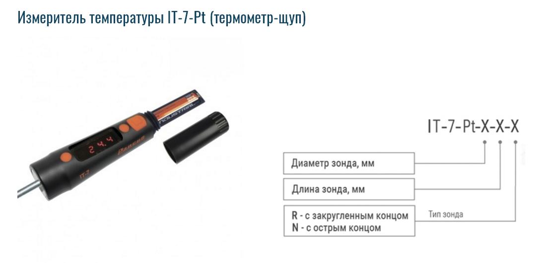 Описание Измеритель температуры IT-7-Pt (термометр-щуп)• Диапазон измерения температуры -70…+200°C• Диапазон показаний температуры -200…+200°C • Высокая точность от ±0,2°С • Удобство • Механическая прочность • Влаго- и пыле- защищённость. • Невысокая стоимость эксплуатации • Гарантия - 2 года ![]() Описание измерителя температуры Рэлсиб IT-7-PtИзмеритель температуры IT-7 (термометр-щуп) предназначен для измерения температуры газообразных, жидких и сыпучих сред. Благодаря использованию платинового термочувствительного элемента с НСХ Pt1000 прибор имеет очень широкий диапазон измерения начиная от -70°C, высокую точность от ±0,2°С и надёжность. Термочувствительный элемент длиной не более 7 мм находится на конце зонда. Для получения точных значений измерения рекомендуется устанавливать зонд в измеряемую среду на глубину не менее 20 мм. Зонд изготовлен из пищевой нержавеющей стали, поэтому прибор можно использовать в пищевой промышленности. Зонд может иметь как округлый, так и заостренный конец. Наименьшую тепловую инерционность имеют приборы с диаметром зонда 2 мм. Для более жёстких условий эксплуатации выпускаются приборы с диаметром зонда от 3,0 до 5,0 мм. Прибор управляется только одной кнопкой. После нажатия кнопки прибор сразу же начинает процесс измерения. Через 10 с. прибор автоматически отключается. Для экономии элемента питания рекомендуется включать прибор после установления температуры (через некоторое время после установки зонда прибора в измеряемую среду). Диапазон измерения температуры -70…+200°C Основная абсолютная погрешность ±(0,2+0,0015|Т|*)°С Напряжение питания от 0,9 до 1,6 В Батарея питания типоразмер ААА напряжением 1,5 В Число каналов измерения 1 Дискретность отчета 0,1°C Время индикации до автоматического отключения 10 с Продолжительность непрерывной работы измерителя от элемента питания до 85 ч Средняя наработка на отказ не менее 20000 ч Средний срок службы 10 лет Габаритные размеры длина 136,5 мм, диаметр 26,5 мм Диапазон температуры эксплуатации –40…+55°С Применение измерителя температуры Рэлсиб IT-7-PtПищевая промышленность: Контроль температуры внутри замороженных продуктов: рыбы, мяса, птицы при хранении и перевозке. Для этой цели оптимально использовать IT-7-Pt-2-120-Nдля рыбы, сосисок, птицы, полуфабрикатов и IT-7-Pt-4-120-N для мяса. Преимущества применения IT-7: высокая точность, маленький диаметр зонда от 2 мм, не оставляющий следов, возможность работы в морозильной камере и рефрижераторе при низкой температуре и плохом освещении, низкая цена. Контроль температуры (экспресс контроль) внутри продукта при его приготовлении: варка, копчение и т.д. Для этой цели также оптимально использовать IT-7-Pt-2-120-N. Применение данного прибора позволяет проводить измерения быстро, за 7…20 с, не повреждать продукт (особенно это касается сосисок) и точно. Контроль температуры в процессе производства пищевых продуктов. Это контроль температуры теста при его приготовлении, контроль температуры мороженой массы на всех этапах производства, жидкого шоколада, жидкой карамели, молока при приготовлении кефира и т.д. Оптимальный тип прибора для этих задач: IT-7-Pt-3-200-R. Прибор обеспечивает высокую точность измерения и малую тепловую инерционность благодаря применению тонкостенного зонда. Длина зонда 200 мм оптимальна для большинства применений. Строительство: Для данной отра