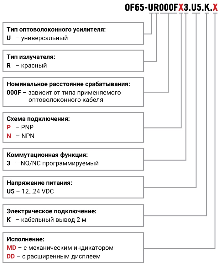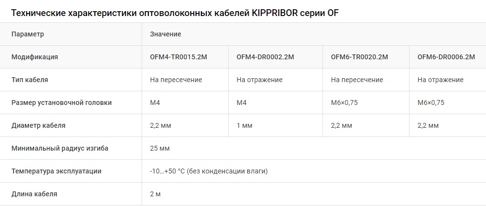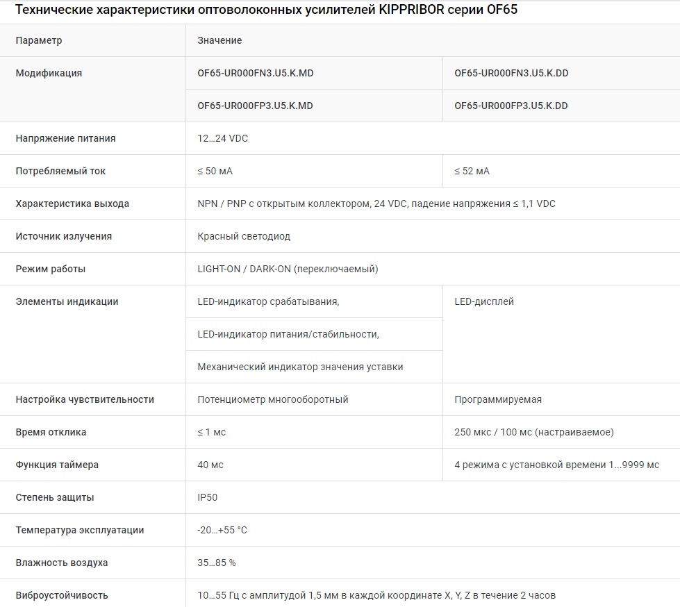 Описание Оптоволоконные усилители KIPPRIBOR серии OF65Оптоволоконные усилители KIPPRIBOR серии OF65 должны использоваться совместно с оптоволоконными кабелями серии OF (поставляются отдельно).Усилитель OF65 является частью оптической системы, включающей в себя оптоволоконный кабель. Такое конструктивное решение позволяет дистанцировать усилитель непосредственно от зоны контроля. Изготовлены в корпусе из пластика, имеют слоты для подключения оптоволоконных кабелей, удобные регуляторы и информативные элементы LED-индикации. В модификациях с дисплеем предусмотрены программируемые параметры. Подключение питающих и сигнальных цепей выполняется через кабельный вывод. Усилители применяются для бесконтактного обнаружения объектов, определения их положения в пространстве, распознавания оптических меток в технологических процессах, подсчета изделий на линиях. Серия OF65 включает в себя модификации с дисплеем и без дисплея. На основе оптоволоконных усилителей, в зависимости от применяемого оптоволоконного кабеля, может быть реализована система на отражение или на пересечение оптического луча. Усилители широко применяются в производственных линиях, автоматах дозирования и фасовки, оборудовании пищевых производств. ![]() ![]() Модельный ряд усилителей KIPPRIBOR OF65![]() Конструктивные особенности оптоволоконных кабелей KIPPRIBOR серии OF Поставка оптоволоконных кабелей осуществляется в состоянии, готовом к эксплуатации. Однако, если возникает необходимость подрезки кабеля, следует пользоваться специальным инструментом. ВНИМАНИЕ! При монтаже кабелей будьте предельно аккуратны. Изгиб кабелей с радиусом меньше минимального, заломы и деформации могут привести к выходу кабеля из строя! На концы кабелей OFM4-DR0002.2M установлены наконечники для подключения к слотам усилителя. На кабелях этой модификации подрезка не может быть выполнена. Похожие товары | |||||||