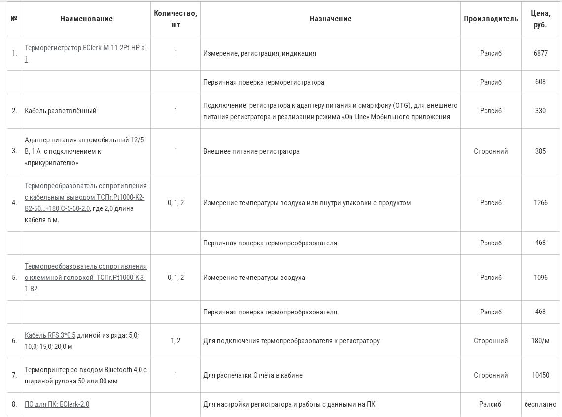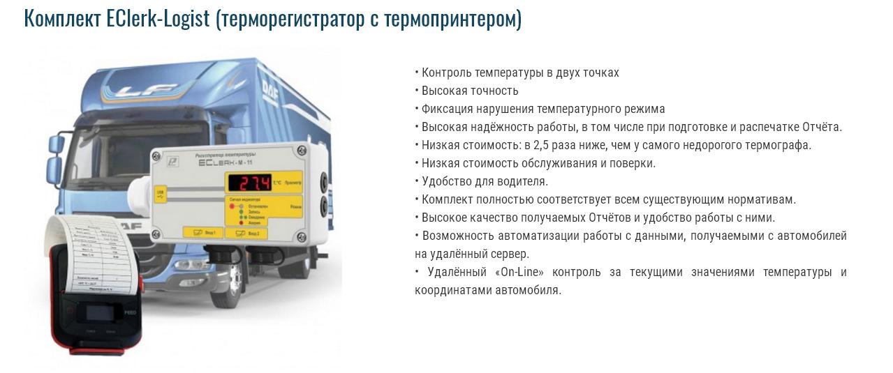 Описание Комплект EClerk-Logist (терморегистратор с термопринтером) ![]() Основные функции, выполняемые комплектом EClerk-Logist Индикация на приборе текущих значений температуры в двух точках и наличия нарушений. Выгрузка данных с регистратора на ПК через USB, анализ данных, архивирование данных, в т.ч. в формате Exсel, подготовка и распечатка Отчёта. Выгрузка данных на смартфон, анализ данных в таблице и на графике, конвертирование данных в Exсel, отправка данных в «два клика» по эл. почте, например Получателю и Отправителю груза. Подготовка на смартфоне Отчёта в pdf и отправка по эл. почте, например Получателю и Отправителю груза. Подготовка на смартфоне Отчёта в pdf в формате термопринтера и распечатка в кабине водителя. Режим GSM модема с отправкой сообщений о текущих значениях температуры и географических координат по эл. почте или SMS с заданной периодичностью и в случае нарушения. Режим Табло с индикацией на смартфоне текущих значений температуры, установленных порогов по температуре и наличия нарушения. Комплект предназначен для выполнения требований....(нажмите, чтобы просмотреть регламентирующие документы). Полный состав комплекта EClerk-Logist ![]() Похожие товары | |||||||