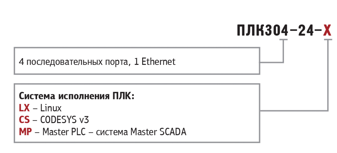 Контроллер имеет следующие модификации: ПЛК304-24-LX, ПЛК304-24-CS, ПЛК304-24-MP