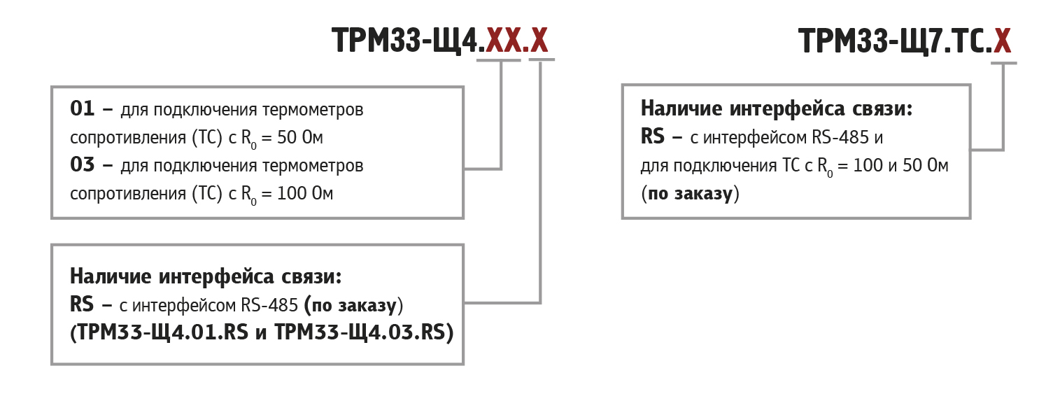 Контроллер имеет следующие модификации: ТРМ33-Щ4.01, ТРМ33-Щ4.01.RS, ТРМ33-Щ4.03, ТРМ33-Щ4.03.RS, ТРМ33-Щ7.ТС, ТРМ33-Щ7.ТС.RS.