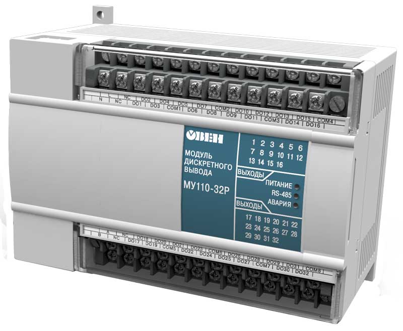 Описание Овен МУ110-32Р Модуль дискретного выводаНазначение модуля дискретного вывода МУ110-32РПрибор предназначен для управления по сигналам из сети RS-485 встроенными дискретными ВЭ, используемыми для подключения исполнительных механизмов с дискретным управлением. Встроенные ВЭ могут работать в режиме ШИМ. Модуль имеет стандартные модификации МУ110-220.32Р, МУ110-24.32Р ![]() Описание модуля дискретного вывода МУ110-32Р, МУ110-220.32Р, МУ110-24.32РМодуль дискретного вывода данных МУ110 работает в сети RS-485 по протоколам ОВЕН, ModBus-RTU, ModBus-ASCII, DCON. МУ110 не является Мастером сети, поэтому сеть RS-485 должна иметь Мастер сети, например, ПК с запущенной на нем SCADA-системой, контроллер или регулятор. К блоку вывода МУ110 предоставляется бесплатный ОРС-драйвер и библиотека стандарта WIN DLL, которые рекомендуется использовать при подключении прибора к SCADA-системам и контроллерам других производителей. Конфигурирование МУ110 осуществляется на ПК через адаптер интерфейса RS-485/RS-232 или RS-485/USB (например ОВЕН АСЗ-М или АС4) с помощью программы «Конфигуратор М110», входящей в комплект поставки. Прибор отвечает требованиям по устойчивости к воздействию помех в соответствии с ГОСТ Р 51522 для оборудования класса А. Модули дискретного вывода данных серии Овен МУ110 имеют выгодное соотношение цены и качества. ![]() ![]() Основные особенности модуля дискретного вывода ОВЕН МУ110-32Р32 канала дискретного вывода, групповая развязка Типы выходных элементов: Р – э/м реле 3 А ~250 В или =30 В Возможность выдачи ШИМ-сигнала с любого выхода Питание блока вывода МУ110-220.32РНапряжение питания:
