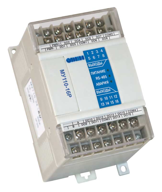 Описание Модуль дискретного вывода ОВЕН МУ110-16РНазначение модуля дискретного вывода ОВЕН МУ110-16Р, МУ110-224.16Р Прибор предназначен для управления по сигналам из сети RS-485 встроенными дискретными ВЭ, используемыми для подключения исполнительных механизмов с дискретным управлением. Встроенные ВЭ могут работать в режиме ШИМ. ![]() МУ110 работает в сети RS-485 по протоколам ОВЕН, ModBus-RTU, ModBus-ASCII, DCON. МУ110 не является Мастером сети, поэтому сеть RS-485 должна иметь Мастер сети, например, ПК с запущенной на нем SCADA-системой, контроллер или регулятор. К МУ110 предоставляется бесплатный ОРС-драйвер и библиотека стандарта WIN DLL, которые рекомендуется использовать при подключении прибора к SCADA-системам и контроллерам других производителей. Конфигурирование МУ110 осуществляется на ПК через адаптер интерфейса RS-485/RS-232 или RS-485/USB (например ОВЕН АСЗ-М или АС4) с помощью программы «Конфигуратор М110», входящей в комплект поставки. Прибор отвечает требованиям по устойчивости к воздействию помех в соответствии с ГОСТ Р 51522 для оборудования класса А. ![]() ![]() Основные особенности модуля дискретного вывода ОВЕН МУ110-16Р, МУ110-224.16Р