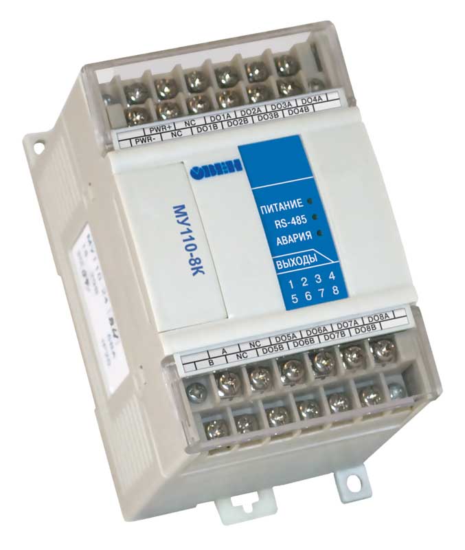 Описание Модуль дискретного вывода ОВЕН МУ110-8КНазначение модуля дискретного вывода ОВЕН МУ110-8К, МУ110-224.8К Прибор предназначен для управления по сигналам из сети RS-485 встроенными дискретными ВЭ, используемыми для подключения исполнительных механизмов с дискретным управлением. ![]() Встроенные ВЭ могут работать в режиме ШИМ. МУ110 работает в сети RS-485 по протоколам ОВЕН, ModBus-RTU, ModBus-ASCII, DCON. МУ110 не является Мастером сети, поэтому сеть RS-485 должна иметь Мастер сети, например, ПК с запущенной на нем SCADA-системой, контроллер или регулятор. К МУ110 предоставляется бесплатный ОРС-драйвер и библиотека стандарта WIN DLL, которые рекомендуется использовать при подключении прибора к SCADA-системам и контроллерам других производителей. ![]() Конфигурирование МУ110 осуществляется на ПК через адаптер интерфейса RS-485/RS-232 или RS-485/USB (например ОВЕН АСЗ-М или АС4) с помощью программы «Конфигуратор М110», входящей в комплект поставки. Прибор отвечает требованиям по устойчивости к воздействию помех в соответствии с ГОСТ Р 51522 для оборудования класса А. ![]() Основные особенности модуля дискретного вывода ОВЕН МУ110-8К, МУ110-224.8К