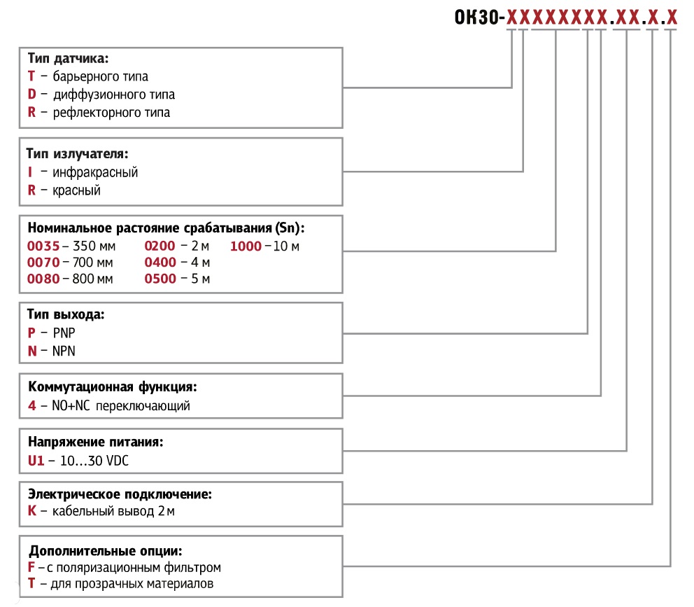 - Модификации датчиков диффузного отражения (D), рефлекторного отражения (R), барьерного типа (T) позволяют организовать принципиально различные схемы контроля объектов.