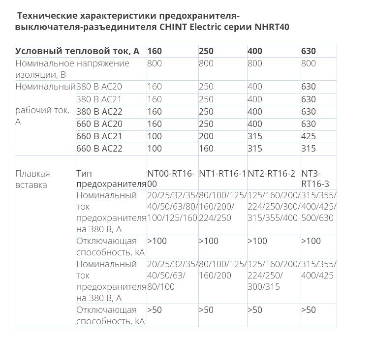 Технические характеристики предохранителя-выключателя-разъединителя CHINT Electric серии NHRT40