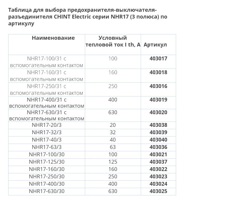 Таблица для выбора предохранителя-выключателя-разъединителя CHINT Electric серии NHR17 (3 полюса) по артикулу