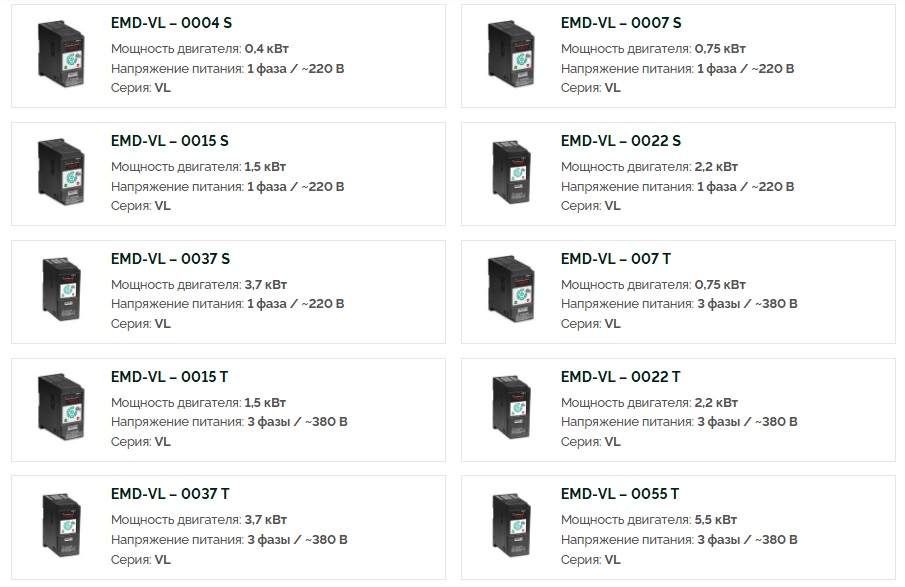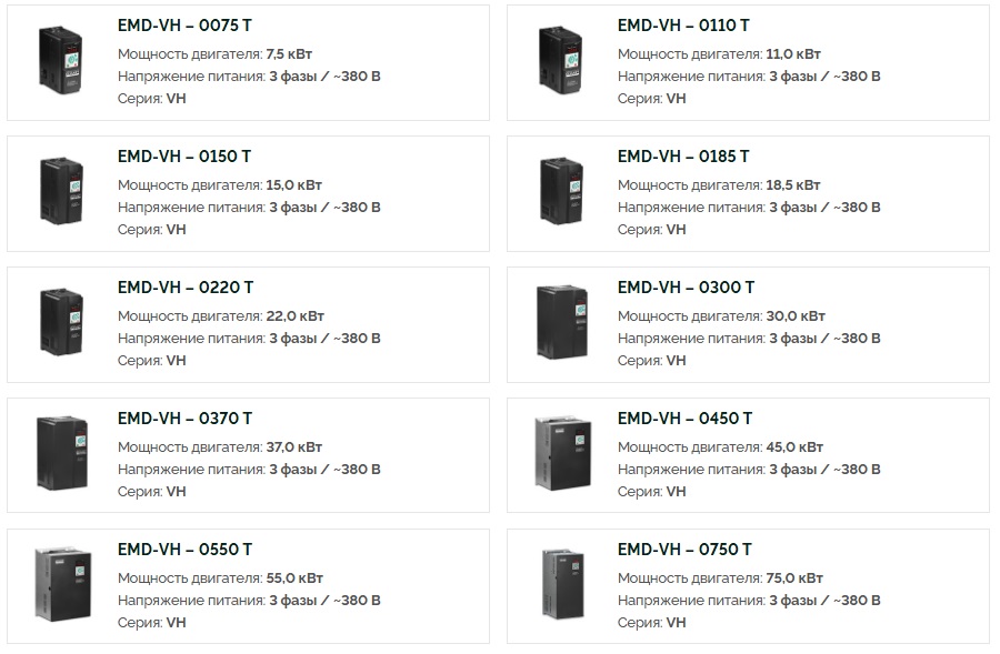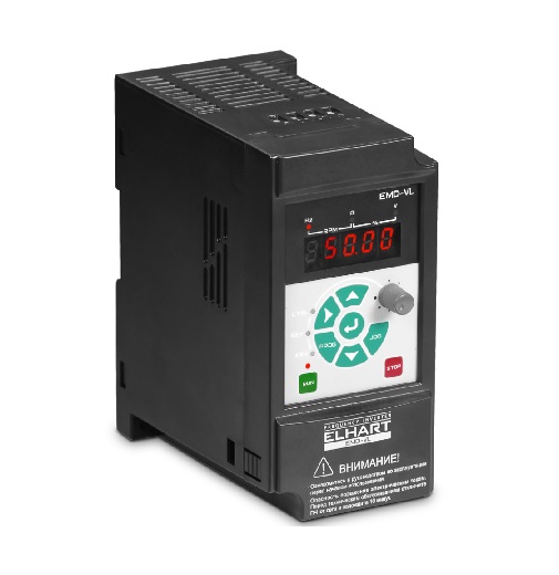 Описание Преобразователи частоты векторные ELHART серии EMD-VПреобразователи частоты EMD-VL и EMD-VH предназначены для управления асинхронным электродвигателем в трех режимах: U/f- регулирование, Бездатчиковое векторное управление (SVC) и Векторное управление с датчиком ОС (FVC). Благодаря режимам SVC и FVC достигается высокое качество регулирования: точность поддержания скорости, высокий пусковой момент и широкий диапазон регулирования частоты.Преобразователь частоты имеет высокую перегрузочную способность (до 180 % в теч. 3 сек.), что позволяет применять его с электродвигателями, работающими в тяжелых условиях (экструдеры, дробилки, нории, промышленные миксеры и мешалки). А при использовании датчика обратной связи (энкодера) достигается высокая точность поддержания скорости, необходимая для приводов весовых дозаторов, токарных и фрезерных станков, манипуляторов, синхронизированных конвейеров. Для подключения к ПЧ дополнительного оборудования могут использоваться встроенные аналоговые (0…10 В и 4…20 мА), дискретные (транзисторные и релейные) входы и выходы, а так же интерфейс связи RS-485 с поддержкой протокола MODBUS RTU. Функционал ПЧ EMD-V может быть расширен за счет применения дополнительных карт расширения: для подключения энкодера (датчика ОС) и для подключения дополнительного релейного выхода. Особенности векторных преобразователей EMD–VВекторный режим управленияДля повышения производительности электропривода предусмотрен векторный режим управления. Благодаря векторному режиму (с обратной связью) достигается высокий пусковой момент на низких скоростях: до 150% при 0,5 Гц. Компактный монтаж Компактный монтаж Преобразователи частоты (модели до 2,2 кВт) позволяют осуществлять монтаж без вентиляционного зазора (корпус к корпусу). Благодаря этому для монтажа преобразователей EMD-VL могут использоваться шкафы компактных размеров. Выносной пульт управления ПЧ серии EMD-VL оборудованы съемным штатным пультом и поставляются с кабелем 2 метра в комплекте. У ПЧ серии EMD-VH пульт не съемный, но возможно подключение внешнего пультам EMD-V-RCP, который заказывается отдельно. Внешний пульт имеет щитовое исполнение для установки на дверь шкафа. Перегрузочная способность ПЧ серии EMD-VL и EMD-VH имеют высокую перегрузочную способность: 150% номинального тока в течение 60 секунд. Поддержка карт расширения Для подключения к ПЧ дополнительных устройств применяются карты расширения EMD-V-IOC и EMD-V-PGC. Карты предназначены для подключения энкодеров (импульсный вход), датчиков с аналоговым сигналом (аналоговый вход) или для дискретного управления (релейный выход). Гибкая настройка дискретных входов Для дискретных входов предусмотрена возможность работы в режиме PNP и NPN. Программно может быть задана задержка срабатывания (фильтрация «дребезга») и логика срабатывания (НО или НЗ). Импульсный вход ПЧ оборудован входом для подключения импульсных (частотных) сигналов. Сигнал с переменной частотой (до 100 кГц) может быть использован для задания выходной частоты (например, при синхронизации приводов) или в качестве сигнала обратной связи ПИД-регулятора (например, от расходомера). Ограничение крутящего момента Преобразователь поддерживает управление скоростью и крутящим моментом. С помощью функции ограничения крутящего момента возможно обеспечить механическую защиту оборудования ил