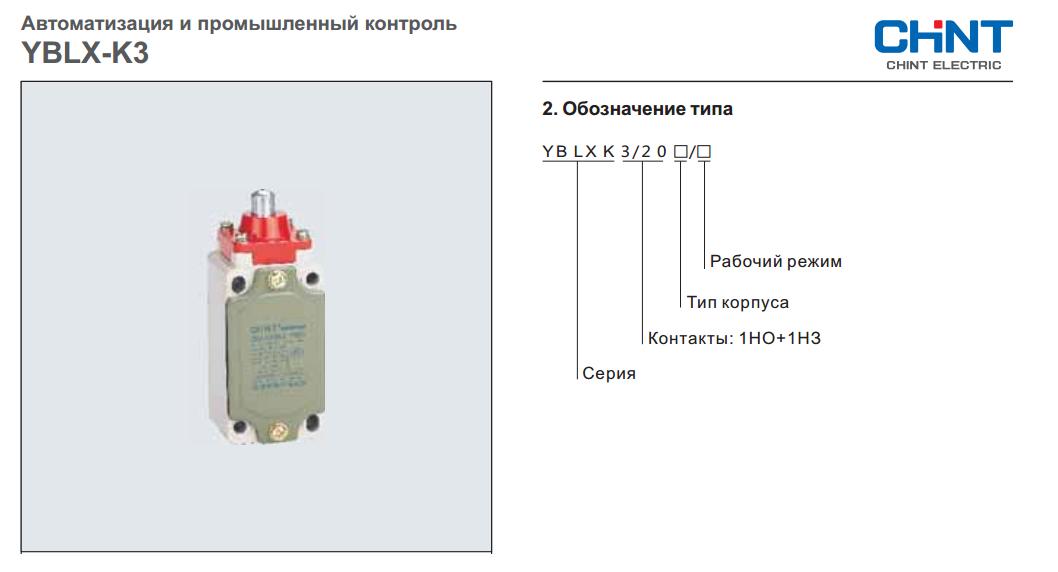 Описание Путевой выключатель CHINT Electric серии YBLX-K3Путевой выключатель CHINT Electric серии YBLX-K3 применяется в электроцепях для регулировки перемещения, изменения направления движения или скорости ходового механизма, автоматической регулировки станка. Путевой выключатель CHINT Electric серии YBLX-К3 имеет степень защиты IP52. ![]() Основные технические характеристики путевого выключателя CHINT Electric серии YBLX-K3