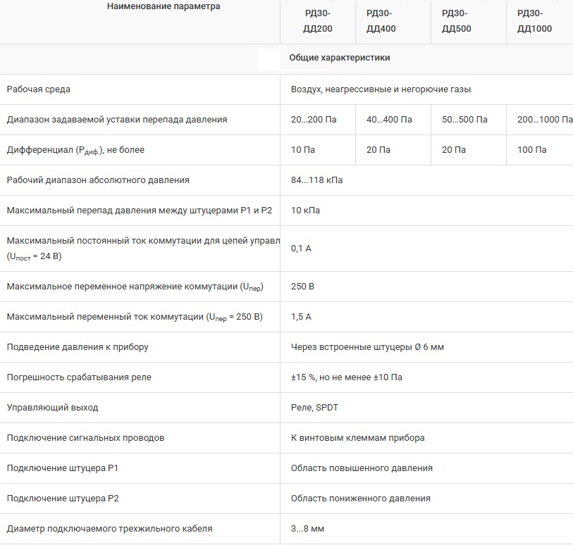 Описание РД30 реле перепада давления воздухаРД30 представляет собой механическое реле перепада давления (прессостат) с поворотным указателем для ручной настройки порога срабатывания. В зависимости от разности давления относительно уставки реле замыкает или размыкает электрическую цепь, осуществляя дискретное управление аварийной сигнализацией.![]() Дифференциальное реле давления серии РД30 является экономичным и надежным решением для мониторинга давления в фильтрах, вентиляторах и воздуховодах HVAC-систем. Реле применяются для контроля: состояния (обрыва) приводных ремней вентиляторов; засорения фильтров; контроля изменения воздушного потока в воздуховодах систем вентиляции. Купить реле давления воздуха можно на нашем сайте, добавив подходящую модификацию в корзину, а также через наших дилеров в удобном для вас городе. Среда измерения Воздух, неагрессивные и негорючие газы. Отличительные особенности Удобная и простая настройка – датчик реле давления воздуха поставляется полностью готовым к эксплуатации, не требует сложных настроек, установка точки отсчета перепада давления осуществляется поворотной рукояткой с нанесенной шкалой. Простой и быстрый ввод в эксплуатацию – комплект поставки включает в себя: реле давления, силиконовую трубку длиной 1,5 м, адаптеры для врезки в вентиляционный короб и обжимные клеммы для удобства монтажа проводов. Не требует подключения напряжения питания – для работы реле необходимо подключить только провода цепи управления аварийной сигнализацией и импульсные трубки. Основные характеристики Коммутируемый ток – до 1,5 А (250 В). Диапазоны уставки: от 20 до 1000 Па. Степень защиты корпуса – IP54. Температура измеряемой среды: -20…+85 °С. Перегрузочная способность – до 10 кПа. Погрешность срабатывания – 15 %, но не менее ±10 Па. Выбор модификации ![]() ![]() Похожие товары | |||||||