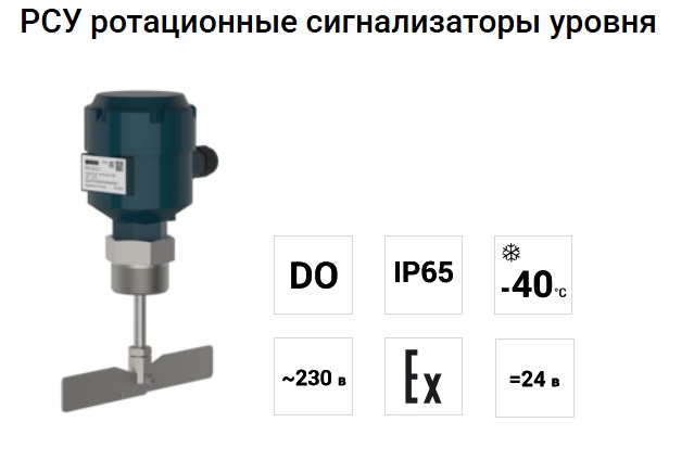 Описание РСУ ротационные сигнализаторы уровняСигнализатор уровня ОВЕН РСУ предназначен для контроля уровня сыпучих веществ в промышленных и сельскохозяйственных условиях. Его принцип работы основан на возникновении реактивного момента двигателя, встроенного в корпус датчика. Датчик имеет лопасти, которые вращаются со скоростью 1 оборот в минуту. Когда уровень продукта достигает лопастей, он останавливает их вращение. Это вызывает появление реактивного момента на валу двигателя, что приводит к срабатыванию микропереключателя выходной цепи сигнализатора.![]() Отличительные особенности ОВЕН РСУ: