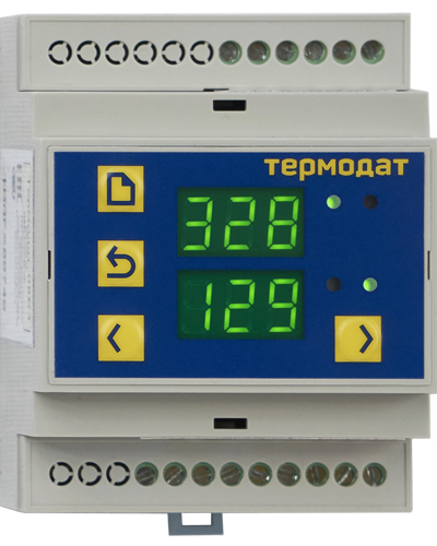 Описание Термодат-08К3-4U - Одноканальный или двухканальный ПИД-регуляторТермодат 08К3-2U/1УВ/1Р - 3 350 руб.Термодат 08К3-4U/1УВ/1Р/1Т - 4 360 руб. Термодат 08К3-4U/2УВ/2Р - 4 690 руб. Термодат-08К3-4U - Одноканальный или двухканальный ПИД-регулятор температуры, аварийный сигнализатор и позиционный регулятор со светодиодными индикаторами, исполнение пластиковом корпусе. Прибор имеет универсальный вход, предназначенный для подключения термопар или термосопротивлений, а также датчиков с токовым выходом. Разрешение 1°С или 0,1°С задается пользователем. Может управлять как нагревателем, так и охладителем. Интуитивно понятное управление обеспечивается 4 кнопками внизу экрана. ПИД-регулятор температуры Корпус для крепления на DIN-рейку или настенного монтажа Яркие светодиодные индикаторы Диапазон температур эксплуатации +5...+40°С Гарантия 3 года Предназначен для: Измерения температуры Регулирования температуры по ПИД-закону Аварийной сигнализации Технические характеристики "Термодат-08К3-4U" Входы: Один или два универсальных входа; Выходы: Реле с переключающимися контактами (7А, ~220В), транзисторный; Закон регулирования: ПИД, двухпозиционный; Диапазон температур измерения: От -270°С до 999°С, (зависит от типа датчика); Напряжение питания: Номинальное ~ 220В, допустимое ~160…250В; Потребляемая мощность: Не более 7 Вт; Корпус: Пластиковый, для монтажа на DIN-рейку или крепления на стену; Дисплей: Светодиодный, четырехразрядный (высота символов 14мм); Четыре светодиодных индикатора режима работы; Габаритные размеры: 87,5х72х59мм; Масса: Не более 0,7 кг; Условия эксплуатации: От +5ºС до +40ºС, влажность от 5 до 90%, без конденсации влаги; Похожие товары | |||||||