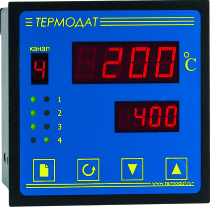 Термодат-11М6 может иметь два, три или четыре канала в зависимости от модели. Каждый канал имеет вход и соответствующее ему выходное реле. Входы предназначены для подключения термопар и термосопротивлений. Каждый выход может управлять нагревателем или охладителем или использоваться для аварийной сигнализации.