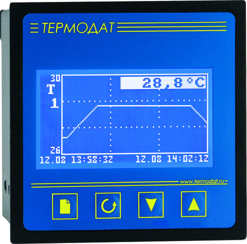 Описание Термодат-16М5 измеритель температуры, сигнализатор, регулятор с графическим дисплеемВнимание: снят с производства!Термодат-16М5 - одноканальный измеритель температуры, аварийный сигнализатор и позиционный регулятор с графическим 3,5" дисплеем. Электронный самописец. Прибор имеет универсальный вход, предназначенный для подключения термопар или термосопротивлений, а также датчиков с токовым выходом. Разрешение 1°С или 0,1°С задается пользователем. Может управлять как нагревателем, так и охладителем. Интуитивно понятное управление обеспечивается 4 кнопками внизу экрана. Особенности измерителя, регулятора Термодат-16М5- Электронный самописец - Графический дисплей - Универсальный вход - Выходы: релейные - Интерфейс для связи с компьютером RS485 - Аварийная сигнализация - Прочный металлический корпус, размер 1/4 DIN (96х96х90мм) - Гарантия 3 года Назначение измерителя, регулятора Термодат-16М5Предназначен для: - Замены устаревших самописцев - Измерения и регистрации температуры - Аварийной сигнализации Технические характеристики "Термодат-16M5"Входы: Один универсальный вход; Выходы:Реле с переключающимися контактами (7А, ~220В); Закон регулирования: Двухпозиционный; Диапазон температур измерения: От -270°С до 2500°С, (зависит от типа датчика); Напряжение питания: Номинальное ~ 220В, допустимое ~160…250В; Потребляемая мощность: Не более 10 Вт; Корпус: Металлический, для щитового монтажа; Дисплей:Графический жидкокристаллический экран 67х33мм, разрешение 128х64 точек; Габаритные размеры: Лицевая панель 96х96мм., глубина 92мм, вырез в щите 92х92мм; Масса: Не более 1 кг; Условия эксплуатации: От +5ºС до +40ºС, влажность от 5 до 80%, без конденсации влаги; Термодат-16М5/1УВ/2Р/485/2М Купить измеритель, регулятор и регистратор температуры серии ТЕРМОДАТ-16 по выгодной цене в Ростове, Ростовской области и других городах Юга России можно в компании «Донские измерительные системы» Доставка измерителя, регулятора и регистратора серии ТЕРМОДАТ-16Мы доставим регуляторы-регистраторы ТЕРМОДАТ-16 в течении одного - двух дней в города: Таганрог, Новочеркасск, Азов, Шахты, Волгодонск, Сальск, Краснодар, Тихорецк, Тимашевск, Сочи, Новороссийск, Анапа, Туапсе, Геленджик, Ейск, Майкоп, Армавир, Волгоград, Элиста, Астрахань, Ставрополь, Невинномысск, Минеральные Воды, Кисловодск, Пятигорск, Железноводск, Черкесск, Нальчик, Владикавказ, Грозный, Махачкала по выгодной цене. Пункты доставки регуляторов-регистраторов серии ТЕРМОДАТ-16 транспортной компанией «Деловые линии».Мы доставим по выгодной цене приборы серии ТЕРМОДАТ-16 до следующих пунктов выдачи: г. Таганрог , Чучева, 1 , г. Новочеркасск , Газетная, 21, г. Волгодонск , Прибрежная, 2а, г. Краснодар, А. Покрышкина, 2/4, г. Новороссийск , с. Цемдолина, Промышленная , 1, г. Сочи ,Краснодонская, 64, г. Пятигорск , Кисловодское, 48, г. Ставрополь, Кулакова, 28 б, г. Волгоград, Гумрак, Моторная, 9 а, г. Волжский , 2-й Индустриальный, 4 а, г. Севастополь , Фиолентовское, 1, Симферополь, Урожайная, 1, г. Астрахань, Энергетиков, 5а Пункты доставки регуляторов-регистраторов серии ТЕРМОДАТ-16 курьерской компанией «СДЭК»Мы доставим по выгодной цене приборы серии ТЕРМОДАТ-16 до следующих пунктов выдачи: г.Таганрог, Петровская, 42, г. Новочеркасск, площадь Левски, 5, г. Волгодонск, Морская, 76, г. Шахты, Советская, 200, г. Краснодар, Текстильная, 9, г. Армавир, Новороссийская, 2/4, г. Новороссийск, пр-т 
