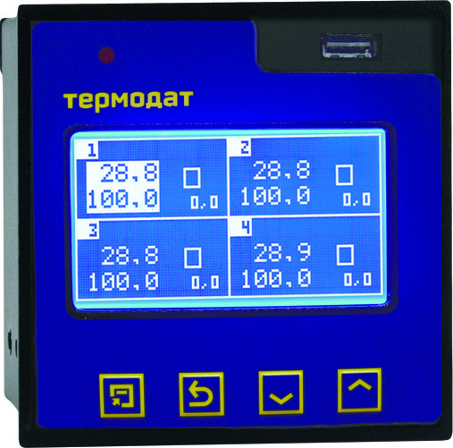 Приборы серии Термодат-16 имеют графический жидкокристаллический дисплей. На дисплее отображается график температуры, измеренное значение температуры и уставку. Прибор оснащен USB-разъемом для снятия архивных данных на Flash-носитель.