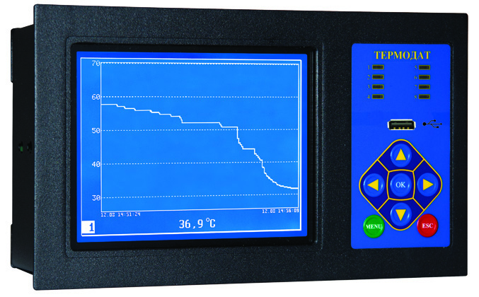 Описание Термодат-18Е5 - одноканальный программный ПИД-регулятор и самописецВнимание: снят с производства!Назначение Термодат-18Е5Термодат-18Е5 - одноканальный программный ПИД-регулятор температуры и электронный самописец с графическим 6" дисплеем. Прибор оснащен USB-разъемом для снятия архивных данных на Flash-носитель. Прибор имеет универсальный вход, предназначенный для подключения термопар или термосопротивлений, а также датчиков с токовым выходом. Разрешение 1°С или 0,1°С задается пользователем. Может управлять как нагревателем, так и охладителем. Интуитивно понятное управление обеспечивается 7 кнопками справа от экрана. Возможности Термодат-18Е5ПИД-регулятор Регулирование по программе Электронный самописец Большой графический дисплей 6 дюймов ПИД-закон регулирования, автоматическая настройка коэффициентов Универсальный вход Логический (цифровой) вход Выходы: релейный, симисторный, транзисторный, аналоговый USB-разъем Аварийная сигнализация Прочный металлический корпус, размер 230х135х68мм Гарантия 3 года Предназначен для: Замены устаревших самописцев Регулирования температуры по заданной программе Аварийной сигнализации Технические характеристики "Термодат-18Е5" Входы: Один универсальный вход, один дискретный вход; Выходы: Реле, транзисторный выход, релейно-симисторный выход; Считывание архива: USB-разъем; Закон регулирования: ПИД, Двухпозиционный, трехпозиционный, регулирование по программе; Диапазон температур измерения: От -270°С до 2500°С, (зависит от типа датчика); Напряжение питания: Номинальное ~ 220В, допустимое ~160…250В; Потребляемая мощность: Не более 15 Вт; Корпус: Металлический, для щитового монтажа; Дисплей:Графический жидкокристаллический экран 120х92 мм, разрешение 320х240 точек; Дополнительные индикаторы:Восемь светодиодных индикаторов режима работы; Габаритные размеры: 230х135мм. глубина 68мм; Масса: Не более 2 кг; Условия эксплуатации: От +5ºС до +45ºС, влажность от 5 до 70%, без конденсации влаги; Модели прибора Термодат18Е5 18Е5/1УВ/1В/1Т/1РС/3Р/485/4М/F - 35500 руб Похожие товары | |||||||