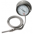 Все биметаллические термометры, в зависимости от крепления оси циферблата, делятся на две группы: основные и радиальные. Ось циферблата осевого биметаллического термометра параллельна оси термобаллона. Радиальный биметаллический термометр отличается от осевого тем, что его ось расположена к оси термобаллона под углом 90°.