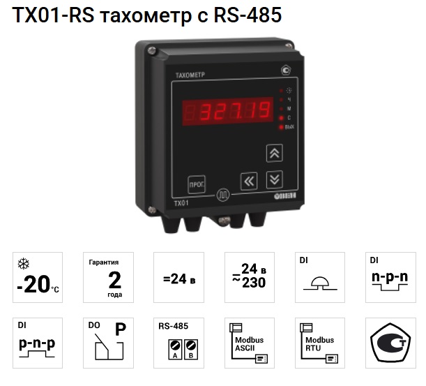 Тахометр ТХ01-RS предназначен для измерения частоты вращения вала, линейной скорости перемещения конвейера, времени наработки агрегатов.