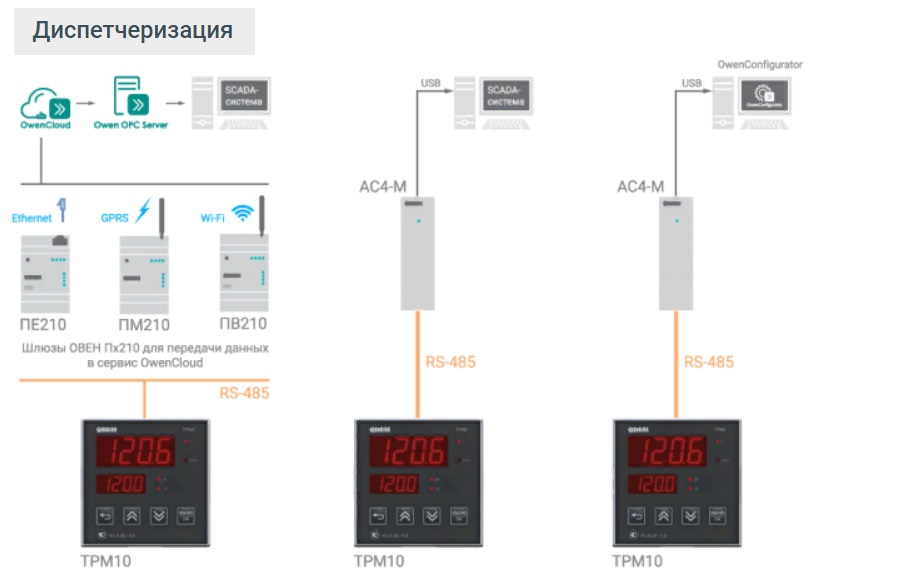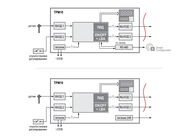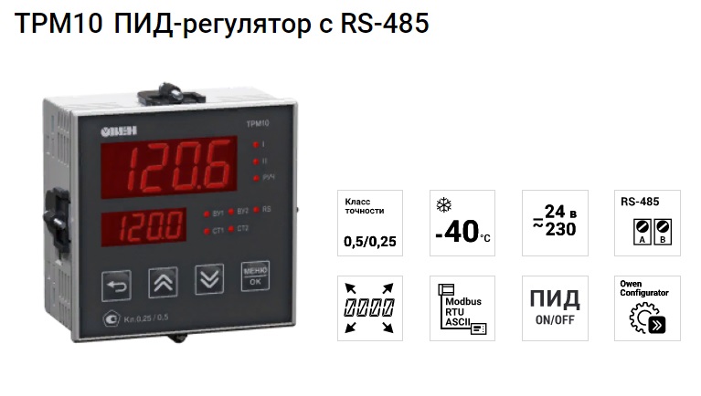 Описание ТРМ10 ПИД-регулятор с RS-485 ТРМ10 – промышленный ПИД-регулятор, предназначенный для измерения, регистрации, контроля аварий или автоматического регулирования температуры и других физических параметров по одному каналу. Прибор зарегистрирован в Государственном реестре средств измерений и может применяться на промышленных объектах, подконтрольных Ростехнадзору. ![]() Возможности регулятора ТРМ10:
