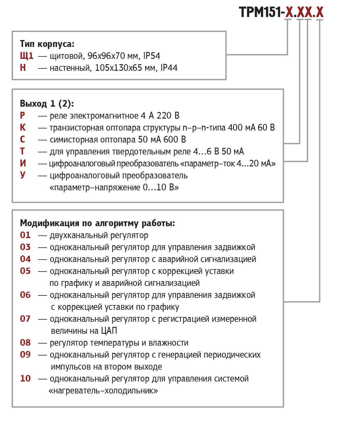 Линейка стандартных модификаций для распространенных технологических процессов Для упрощения конфигурирования прибора ТРМ151 компания ОВЕН разработала линейку модификаций, ориентированных на решение типовых задач автоматизации. Каждая модификация имеет жесткую структуру, которую конфигурировать не требуется. Пользователю остается только задать рабочие параметры. ВНИМАНИЮ ПРОИЗВОДИТЕЛЕЙ ОБОРУДОВАНИЯ! Наши специалисты готовы создать на базе ТРМ151 СПЕЦИАЛИЗИРОВАННЫЙ БЛОК УПРАВЛЕНИЯ для автоматизации оборудования, производимого Вашей компанией. Кроме того, группа технической поддержки ОВЕН может создать для Вас на базе любой модификации ТРМ151 ЗАКАЗНУЮ КОНФИГУРАЦИЮ, комбинирующую различные функциональные элементы стандартных модификаций. ![]()